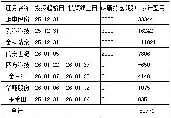 元月最后一周待发转债股票累计盈利50971元(占总收益的84.7%,账户年初至今收益率5.96%)比上周减少11520元,市值465760元(仓位43%)比上周增加51210。