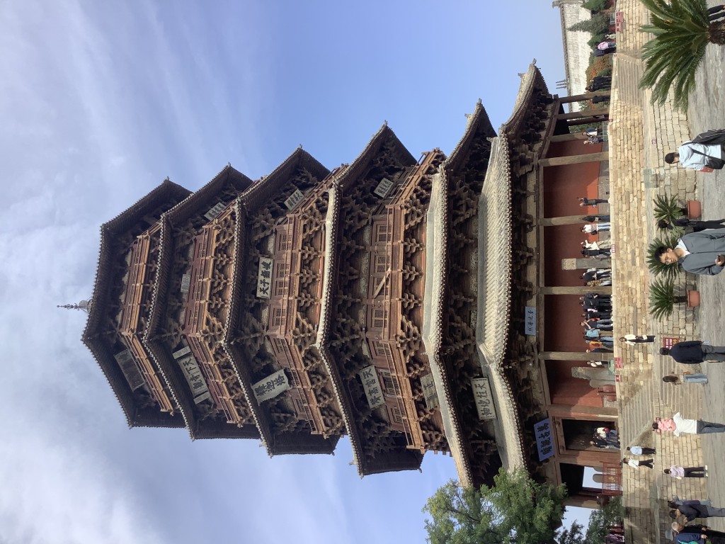 周日上午去看木塔。到了木塔底下,真是巨构,辽代的工匠真是了不起。木塔高六十多米,有现在二十层楼那么高。在没有什么高楼的古代,这么高的木塔,其惊人程度简直不敢想象。梁思成的评价是“绝对的overwhelming”,真的没有夸张的成分。考虑到木塔已经在这个地方立了近一千年,真的是奇迹。