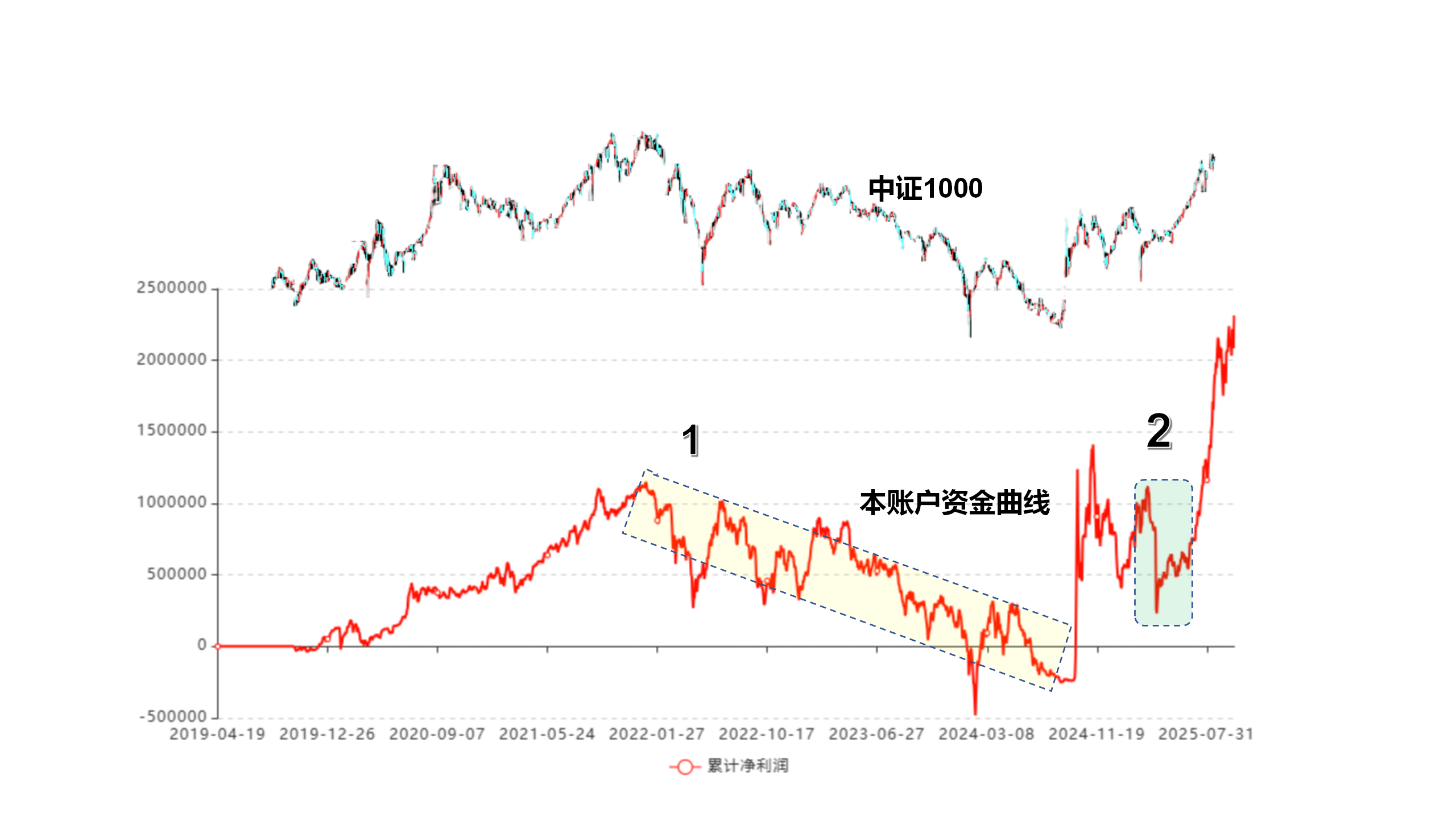 阶段1:这段叠加中证1000指数走势,可以看出,这段回撤和中证1000的下跌同步。主要原因是账户没有在逆趋势条件下相应的止损能力。