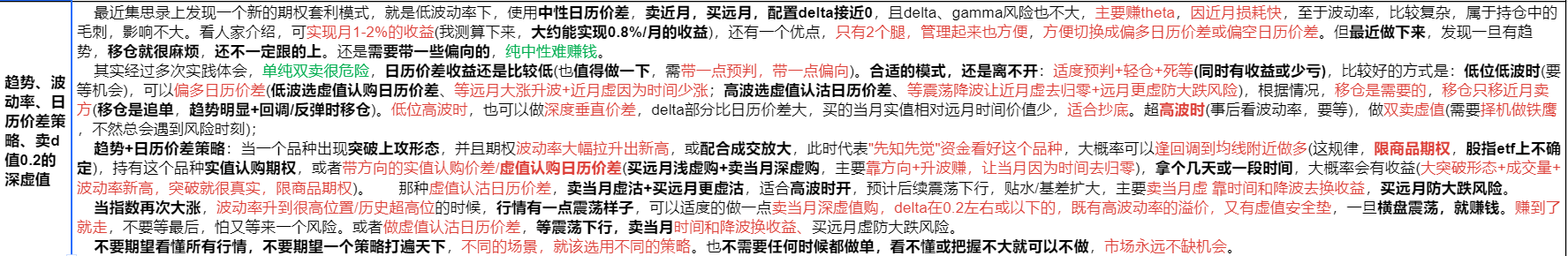 我将完全放弃中性策略,重点还是预判,依据预判做偏多、偏空价差了,不限制做日历价差,也可以做垂直价差(如果预判降波,但趋势还在),甚至做买波策略(如果预判大升波的大涨行情),一切根据研判分析来 定方向、仓位。
