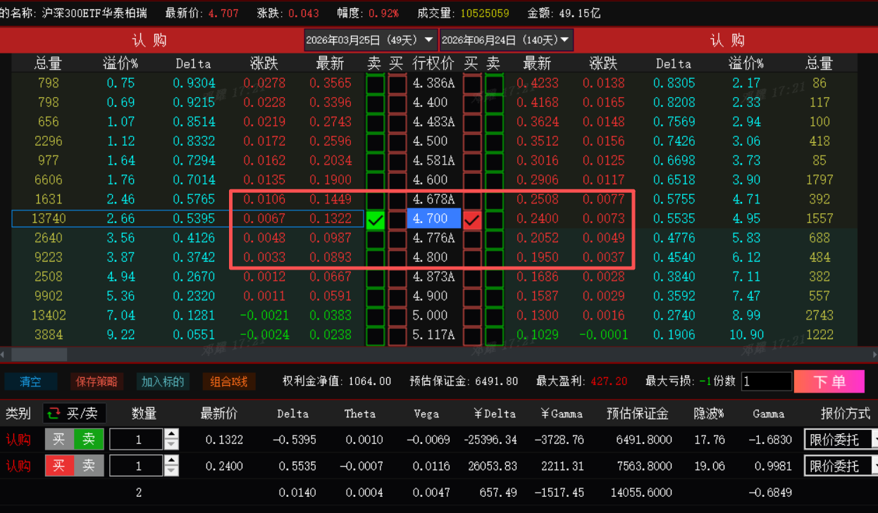 1、认购偏多日历价差的模式(适合低波趋势),以及目前市场高波,趋势明显的情况,后面平滑切换。