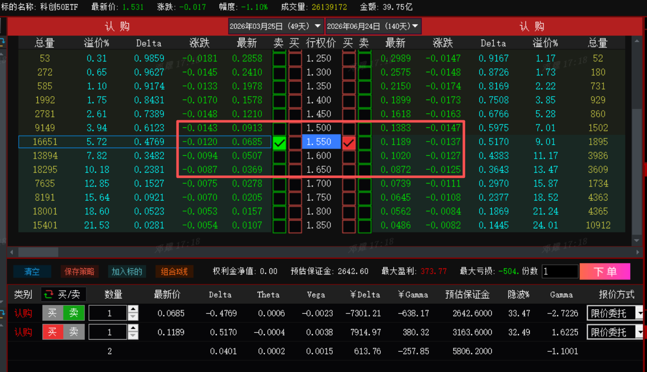 这不是很简单的事情么?你看下面的图,各个期权的溢价率不是明明白白的么,用3月同行权价的期权的溢价率,减去2月同行权价期权的溢价率,不就是3月这个期权一个月的收益么?(6月的溢价率-3月的溢价率)/3,不就是6月这个期权一个月的损耗么?这样一对比,就知道这一组是否值得做了。我都在汇点里面设置好了,一点记策略组合,就出来了,当天的涨跌,各期权的溢价率、波动率、组合theta、vega都能看到。一个月...拿科创50ETF沽举例:2、3月平值1.5;3月溢价率4.44%,2月溢价率2.38;溢价率差值:2.38/(4.44-2.38)-1=0.16 是这样计算的吗