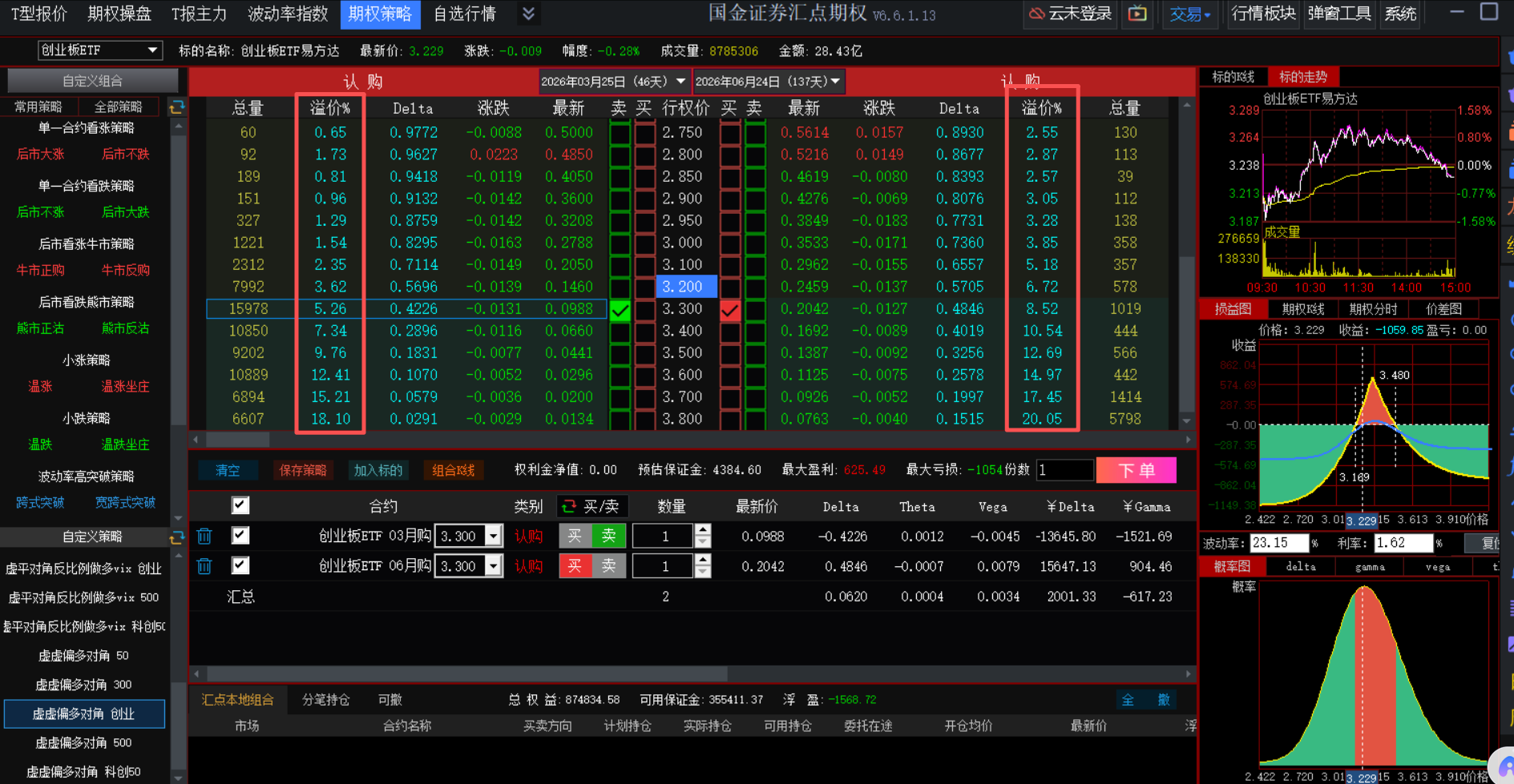 我都在汇点里面设置好了,一点记策略组合,就出来了,当天的涨跌,各期权的溢价率、波动率、组合theta、vega都能看到。