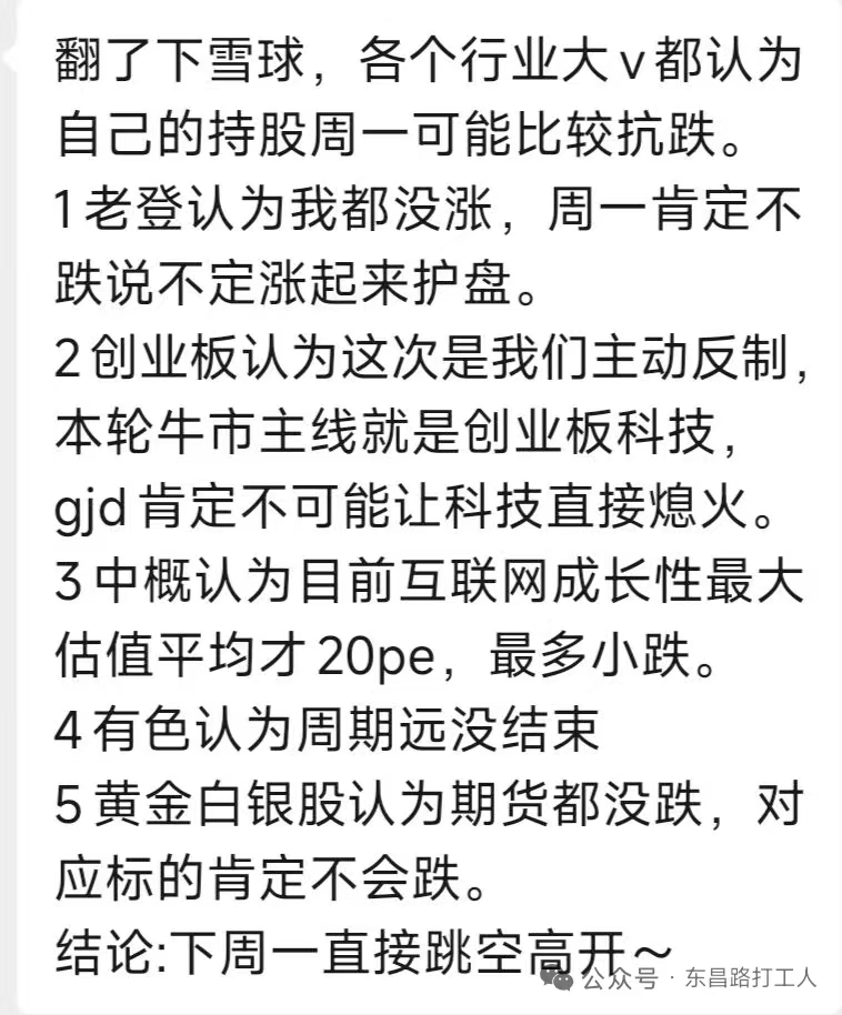 一整天都在刷雪球关于下周大盘的看法,也和群友交流了一整天,说法有以下:1. 红利,老登股东认为,连跌几个月就是为了这次护盘。2. 券商股东认为,一直压着不涨,终于有护盘的机会了。3. 对于场外踏空资金认为,之前踏空,这次肯定要进来抄底了。4. 研究宏观的认为,这次隔壁捉襟见肘,已经落下风,对我们属于利好,不仅不会跌,反而必须大涨,不然说不过去。5. 研究大盘的认为,好不容易有点行情,不会让大盘再...牛逼拭目以待吧