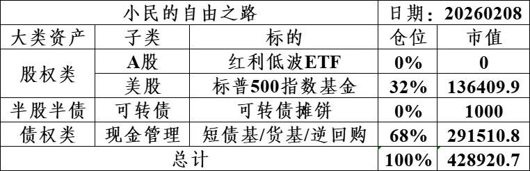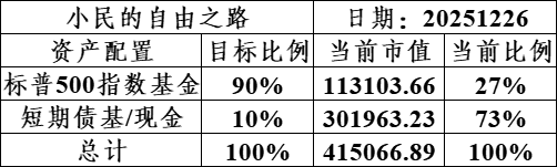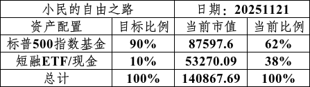 看对、做对、重仓做对之间存在鸿沟,是三种境界,我知道自己是在做对的事情,但是还没有做到敢于重仓。当前的权益仓位与目标仓位差距较大,待12月的一笔存单到期后差距更大,存单到期后计划跟着增量资金分批买入标普500ETF,平滑过渡至目标配置。