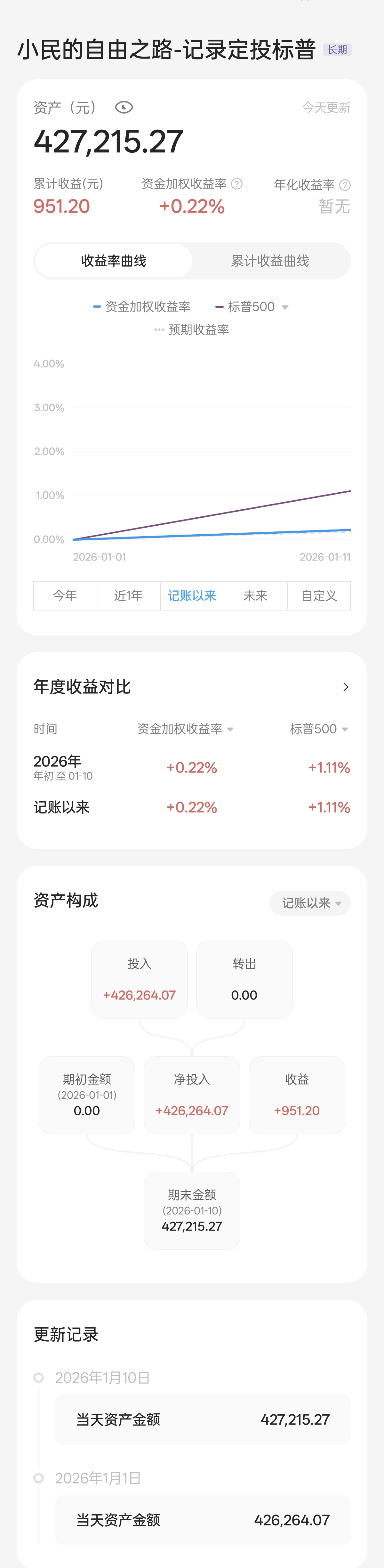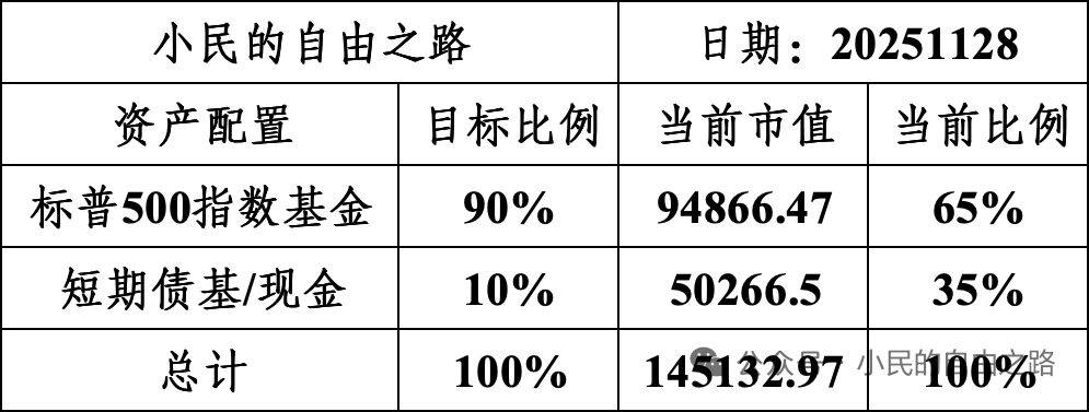 周记20251128:一、目标与规划1.长期财务目标:积累300万元可投金融资产。2.投资原则: 坚持标普500指数,不碰行业和个股。 坚持定期定额买入,不择时。 坚持资产再平衡,大跌买入大涨卖出。 坚持长期持有,无视宏观市场噪音。3.资产配置规划: 权益资产(90%):标普500指数基金(513500/018738)。 类现金资产(10%):短期债券基金...为了验证申购链接基金可以得到平价的标普500,我就去翻了一下说明书和公告。结果得到了以下两个信息。