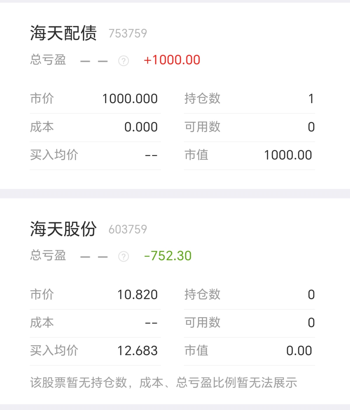 2.参与海天配债。看到配债的思路,想践行一遍配债操作流程,没想到正股跌出翔,交学费了。