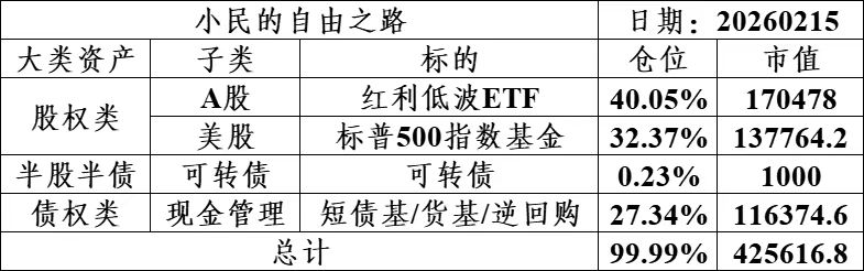 理由:8.03倍市盈率(2026年2月13日数据,下同),0.84倍市净率,股息率4.67%。我不需要大仓位的现金管理来保持流动性,股息率4.67%的机会成本高于现金管理。类似于红利低波策略摊双低(低市盈率、低市净率)大饼。市净率跌破1倍,现金分红后买入ETF等于折价买入ETF净资产。