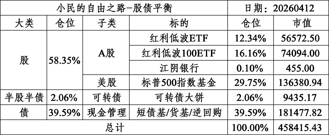 标普500指数的估值太高了,待清仓资金到账后换至低估值高股息的股票,借助红利低波100ETF工具实现这一配置,目前红利低波100指数的市净率0.91、股息率4.77%,计划组合内的股性配置最高60%。