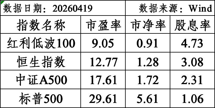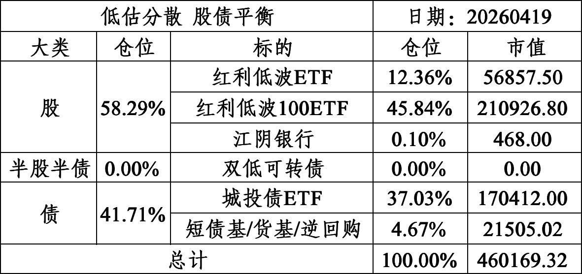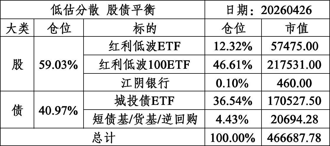 一、资产配置二、本周操作1.买入红利低波100ETF。2.赎回标普500指数基金,4月13日确认,4月17日到账。三、反思标普500指数的估值太高了,待清仓资金到账后换至低估值高股息的股票,借助红利低波100ETF工具实现这一配置,目前红利低波100指数的市净率0.91、股息率4.77%,计划组合内的股性配置最高60%。标普500的估值不高吧,我反而觉得下跌空间有限