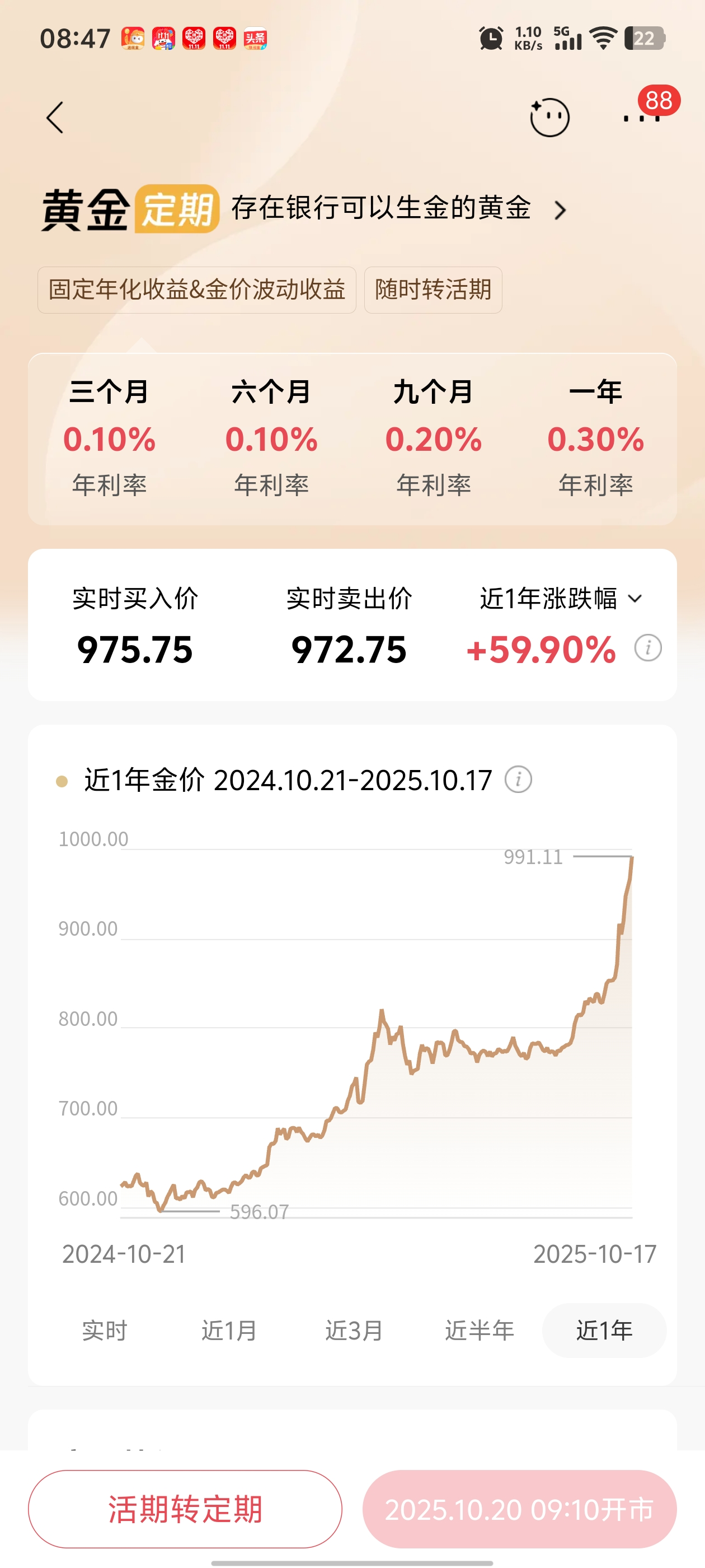 我用民生银行的账户金,比招行的便宜一点,存够10克活期转成定期。