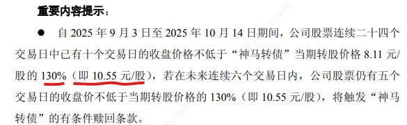 自 2025 年 9 月 10 日至 2025 年 10 月 22 日期间,公司股票连续二十五个交易日中已有十个交易日的收盘价格不低于“神马转债”当期转股价格 8.11元/股的 130%(即 10.55 元/股),若在未来连续五个交易日内,公司股票仍有五个交易日的收盘价不低于当期转股价格的 130%(即 10.55 元/股),将触发“神马转债”的有条件赎回公告好像有点问题。连续4天应该就可以强赎。因为要提前五天发提示性公告,所以公司舍弃了一天。