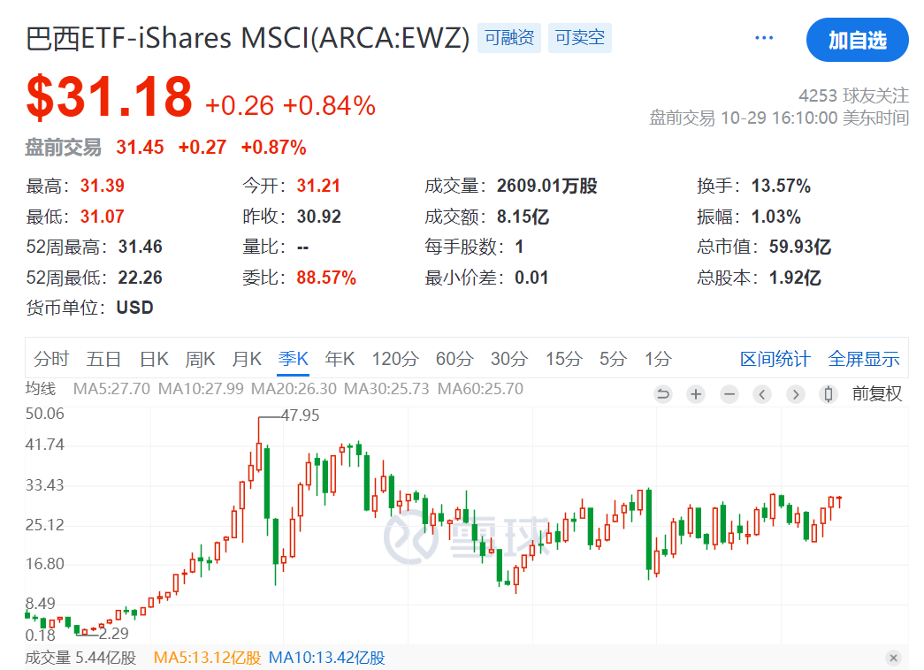怎么说呢,沙特ETF上市的时候赶上了大A的低谷,场内QDII基本上都带点溢价。而新兴亚洲上市的时候就没有这样的好运气了,它上市的时候沙特ETF也享受不到溢价了。所以投资巴西ETF,基本上也没有什么溢价可言,主要是看降息周期巴西的股市能不能表现良好。成分股高度集中于大宗商品,例如淡水河谷(Vale)和巴西石油(Petrobras),