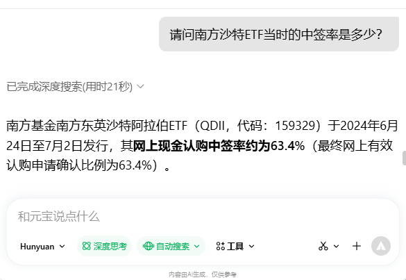 南方基金南方东英沙特阿拉伯ETF(QDII,代码:159329)于2024年6月24日至7月2日发行,其网上现金认购中签率约为63.4%(最终网上有效认购申请确认比例为63.4%)。