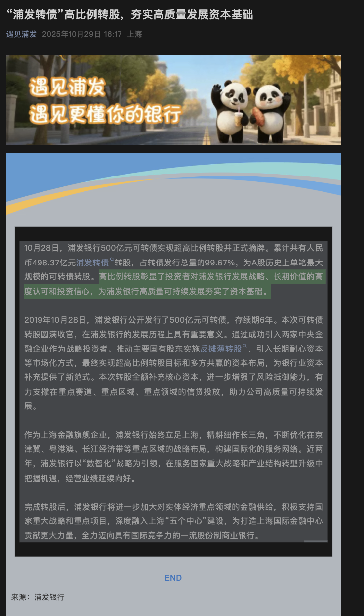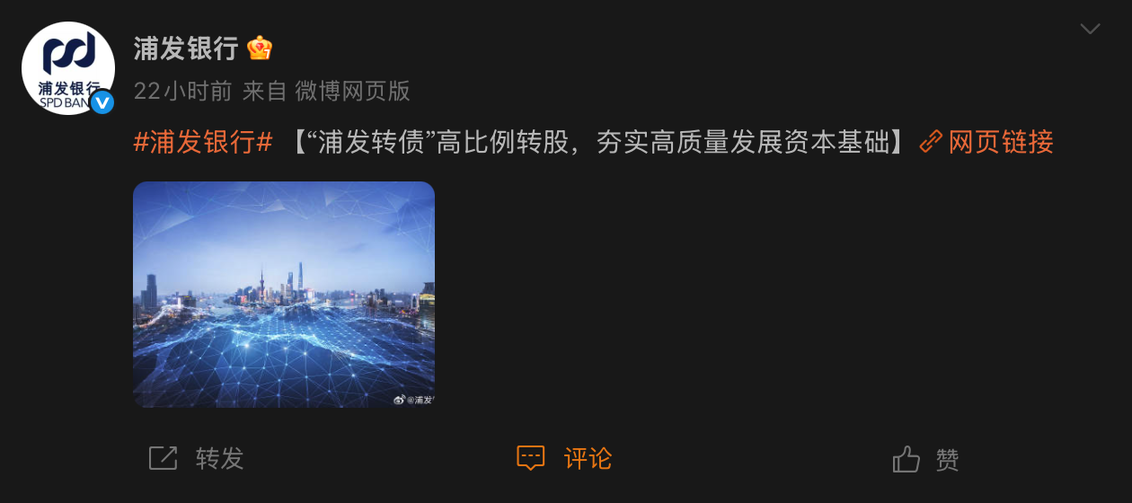浦发银行在官微上对浦发转债的大比例转股还进行了宣传,表示“夯实高质量发展资本基础”,白嫖投资者6年低息资金悄悄过去也就算了,临到期找帮忙的资金溢价转股很光荣一样还要宣传一下。