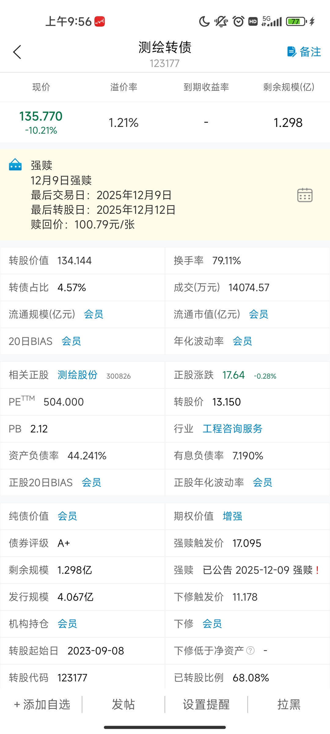连续杀了几日溢价了。 强赎回数日子的可转债不管后面强赎回不强赎回,都会在强赎回数到10-15个交易日期间杀溢价,公司不强赎回的话再升高溢价。 所以不管强赎回与否,强赎回数日子的可转债先回避再说。 真认为不会强赎回愿意去赌也是等到满足15日当日再进场赌不强赎回。 博弈注意把握时间点比较重要