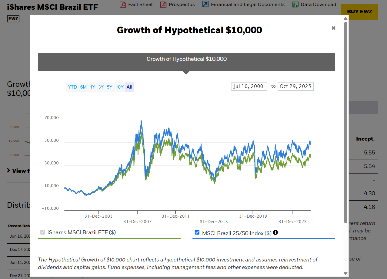 查了下美股巴西ETF的历史收益如下,20年到现在25年大概5倍