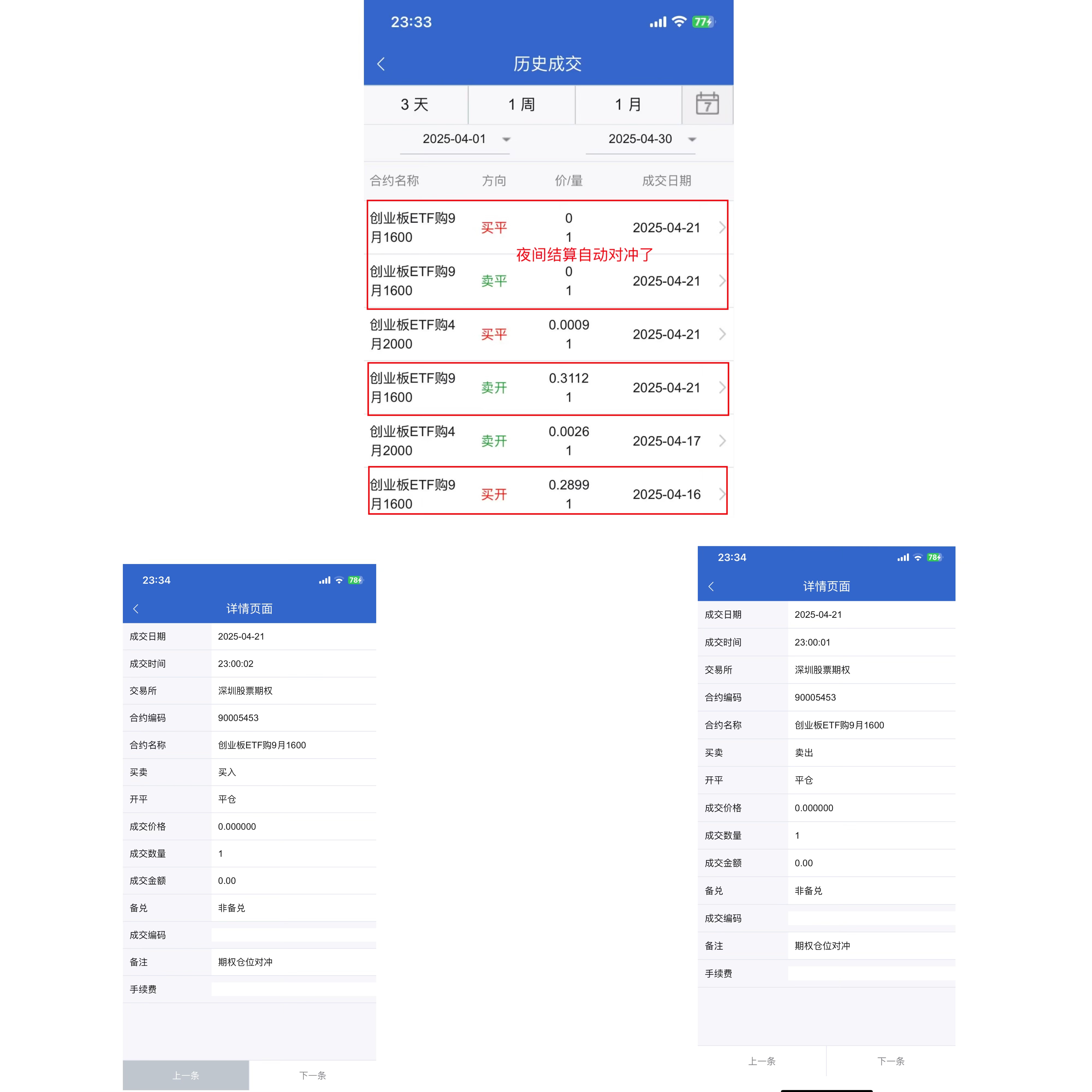 这个图是我 4 月份操作时,本来想做波段。先买开一张购,然后卖开相同的期权,夜间结算时直接对冲了(省了一次平仓的手续费,因为卖开不收费)。