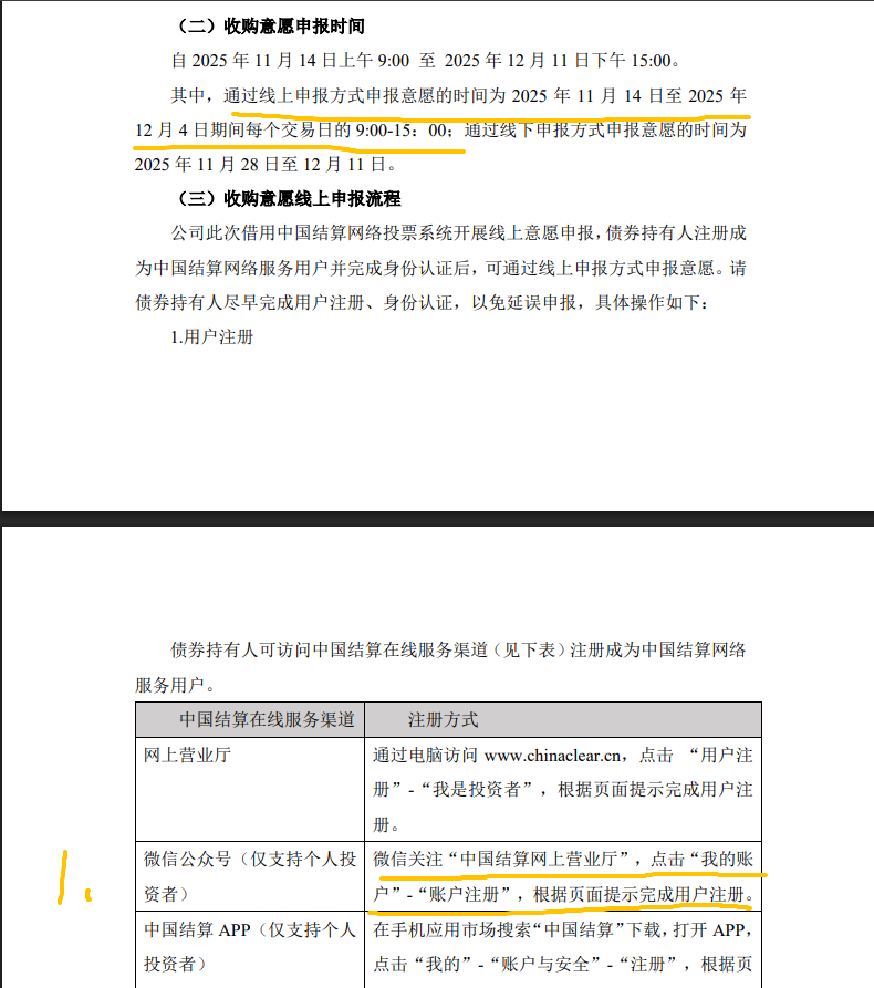 为进一步保障债券持有人的利益,对于未能在权益登记日(2025 年 11 月 11 日)前完成确权工作的债券持有人或因特殊原因未能通过中国结算网络投票系统申报意愿的债券持有人,若希望参与本次收购,可以按照本公告内容通过线下进行申报。
