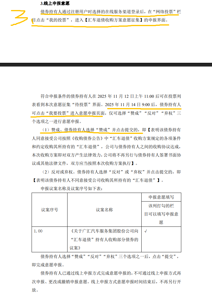 未完成确权登记的债券持有人或未能通过线上申报方式申报意愿的债券持有人同意接受本次收购方案的,可在 2025 年 11 月 28 日上午 9:00 至 2025 年 12 月 11 日下午 15:00(以下简称“线下意愿申报时间”)向发行人申报意愿,且本次收购的“汇车退债”需符合本次收购方案所确定的各项条件,如债券持有人不同意接受本次收购方案或未在意愿申报时间内完成申报意愿的,或债券持有人持有的“汇车退债”不满足收购方案确定的条件的,该债券持有人所持有的“汇车退债”将不被收购。