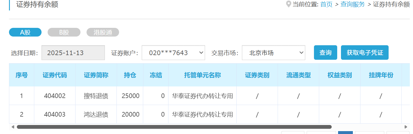 我华泰证券账户能查询到汇车退转债,但查不到鸿达转债与搜特转债,大家有没有类似的情况?鸿达转债与搜特转债去哪里了?在中登上查到了,查证券账户查不到。怎么才能前台可见?