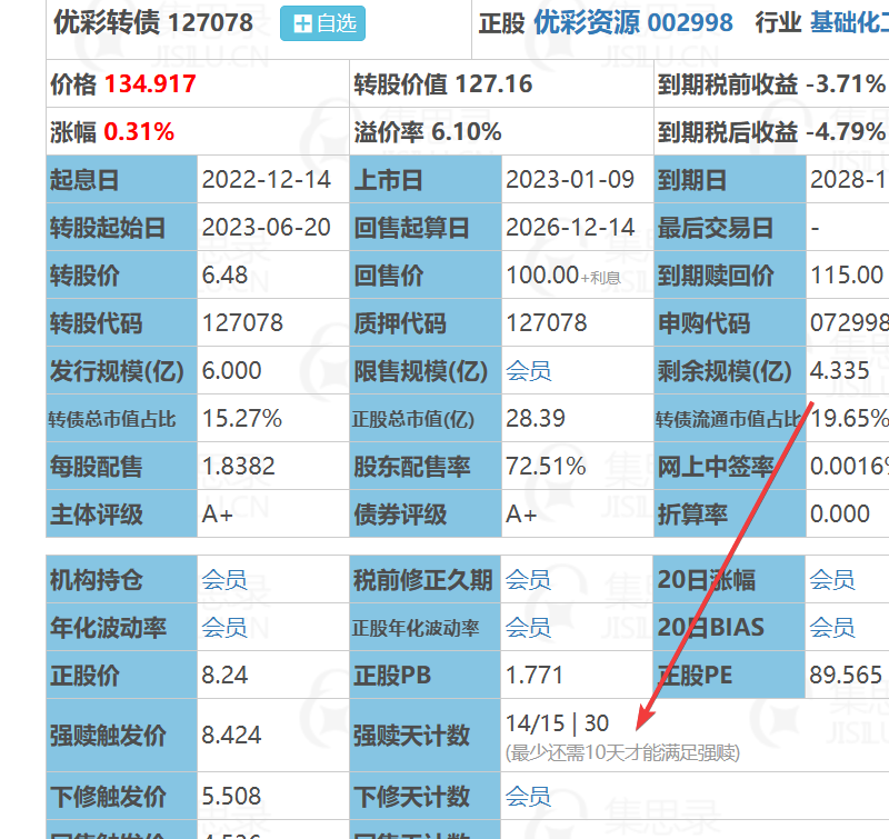 优彩按照神马转债的计数规则,应该全部作废掉了,重新发预计赎回公告才对。已经电话公司,公司表示正在跟深交所监管沟通,最快明天收盘后可能有公告。有仓位的也可以电话公司催促一下。 最后一天仅差一分钱,公司毫无作为,后边马上就要消天数了,尾盘大单压了七千多手,里边大资金也不同意赎回。基本可以判断赎回没戏了。 四亿多小盘,130转股价格,化工赛道,目前热门,套利党走后,保守140以上了。