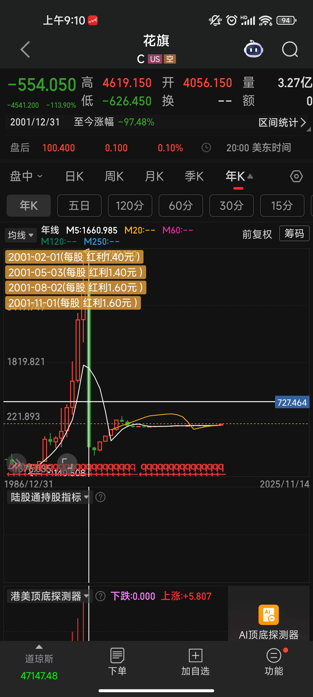 答案是:花旗的“惨”源于其自身无药可救的“内伤”,而精明的救援者只会救“可救之人”,不会往无底洞里填钱。 您提供的这张年K线图,完美地印证了这一点。