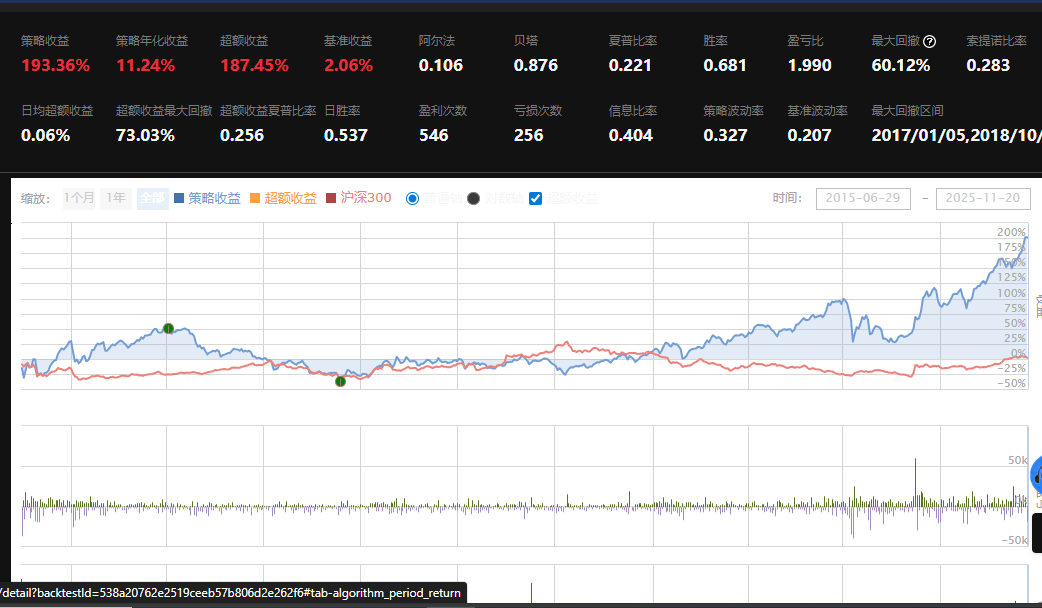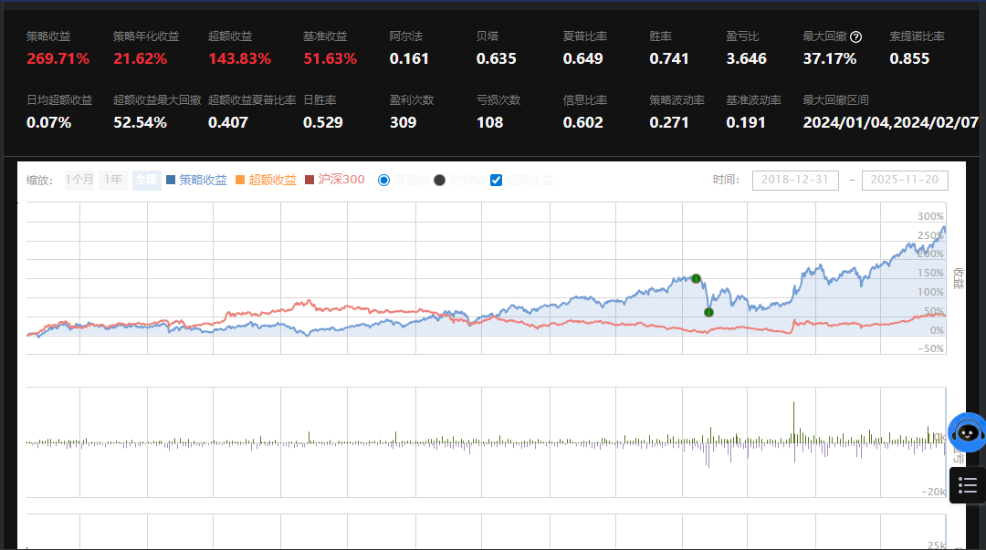 我回测了一个小市值策略,简单来说就是在剔除停牌、st、*st以及上市不足60天的股票后,每月月初调仓换股,总市值从小到大排列取前30个A股股票,回测时间是2018年底到昨天。