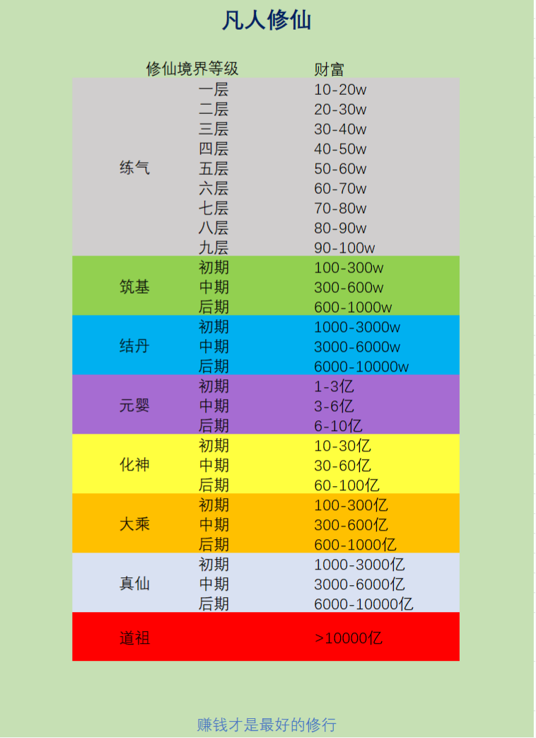 为进一步促进投资界的交流与发展,规范修炼体系的认知,避免因境界称谓不一而产生的混淆与歧义,经由修真联盟倡议,特制定《凡人修仙境界统一标准》,现予以颁布,望周知。