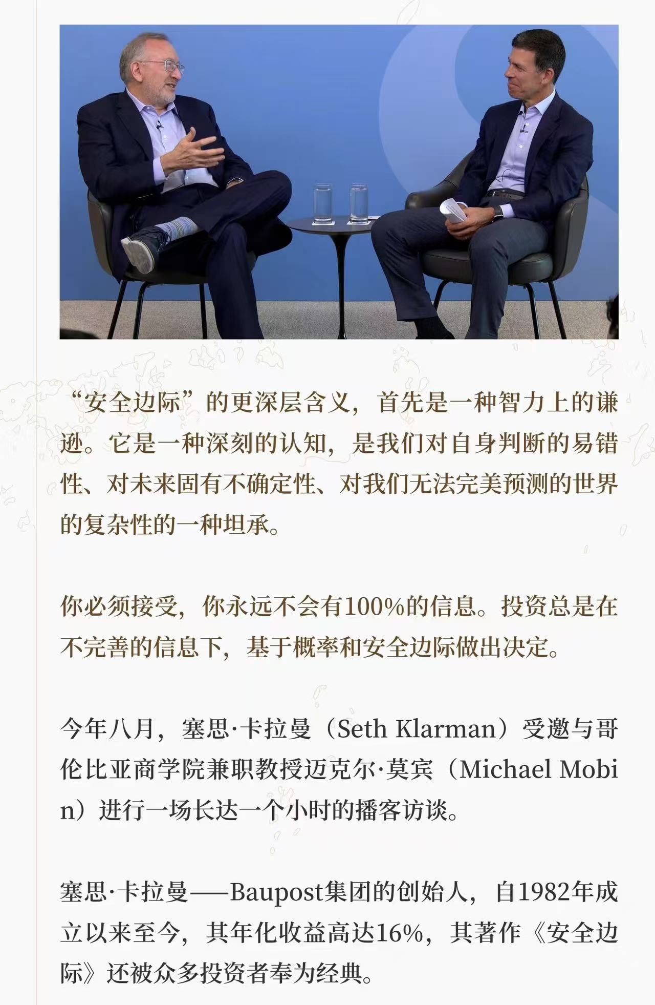 主要是想共鸣一下关于安全边际的概念,以及感叹这就是投资的本质。不知道为什么大家执着与指数这件事。这里的指数应该都是指的宽鸡指数。我刷的是b站32分钟的版本采访,咋没注意到赛斯卡拉曼谈指数............https://www.bilibili.com/video/BV11cbQzyEEA/?spm_id_from=333.337.search-card.all.click&vd_source=0da67570c5ad501e3f61171bbedf12d4