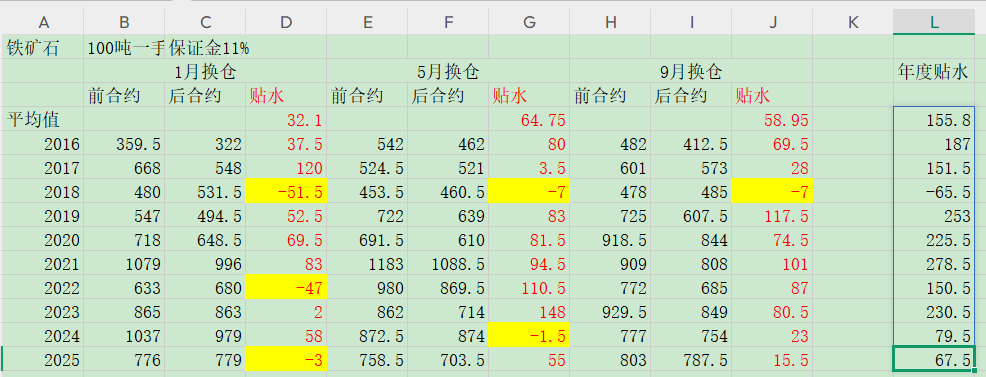 这是按照交割月前一天换仓来计算贴水的表,从表里看铁矿石的贴水在降低,这两年年化只有7个点左右。