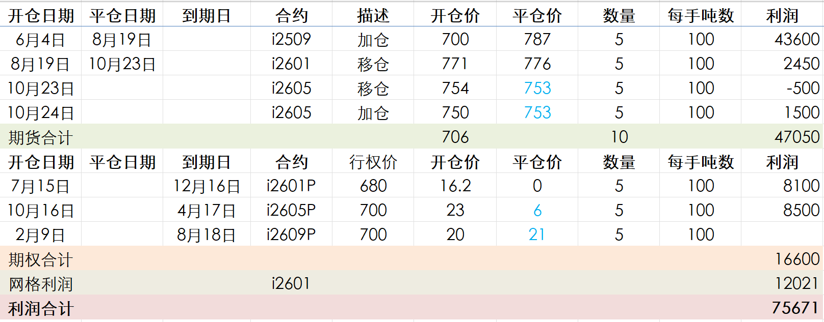 25年06月04日,i2509,700,5手,后移仓至i2601、i2605,成本降至662。25年10月24日,i2605,750,5手。