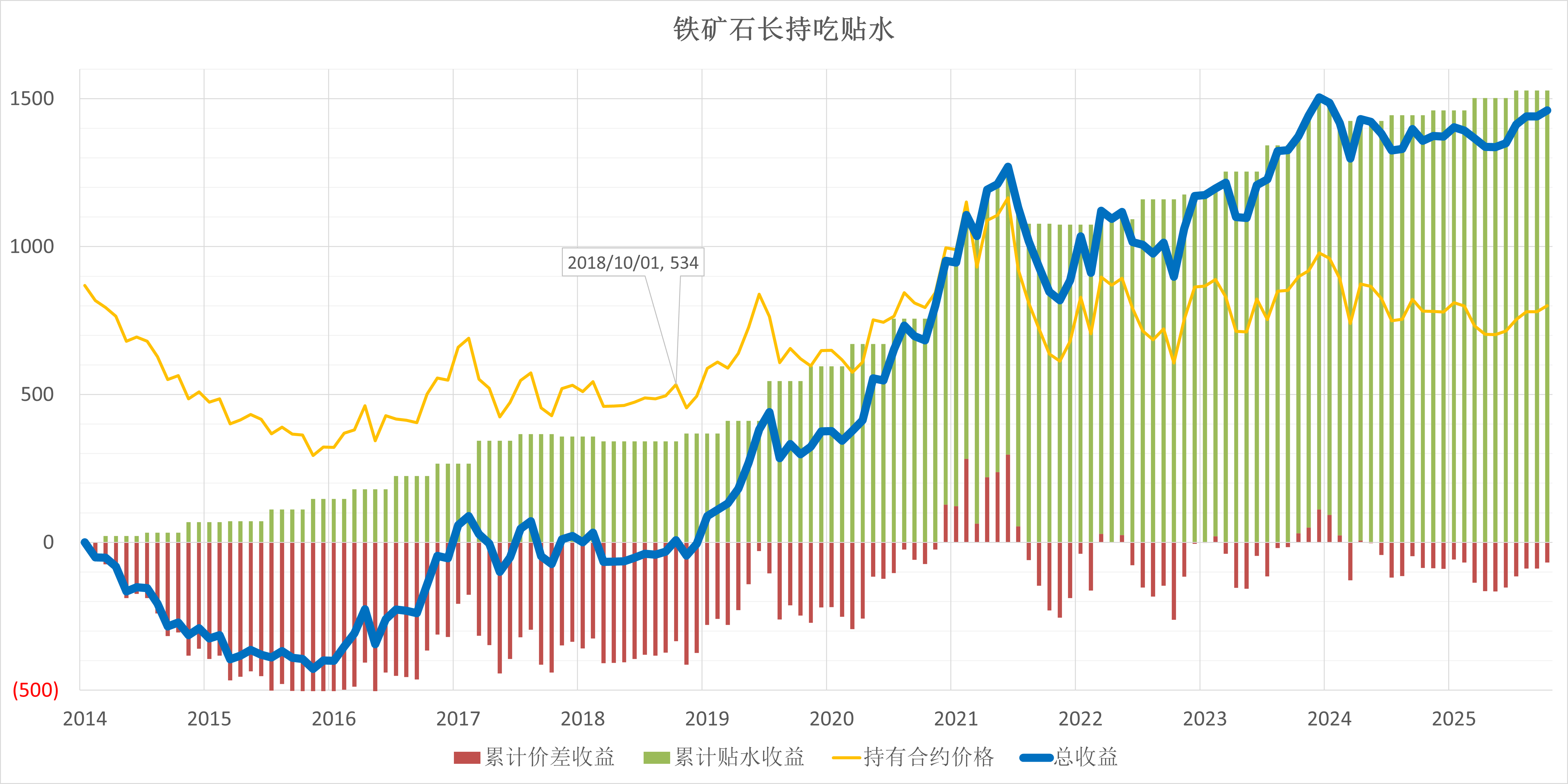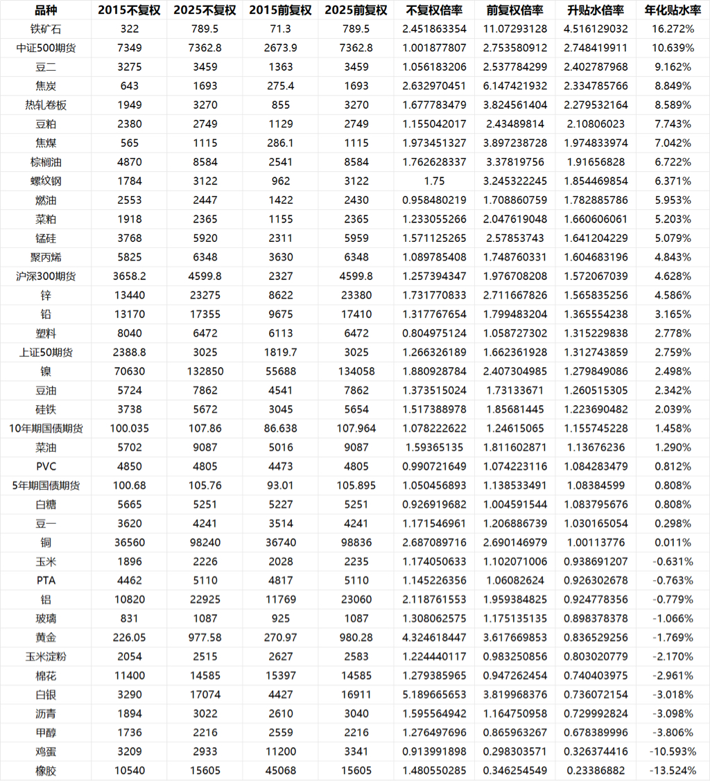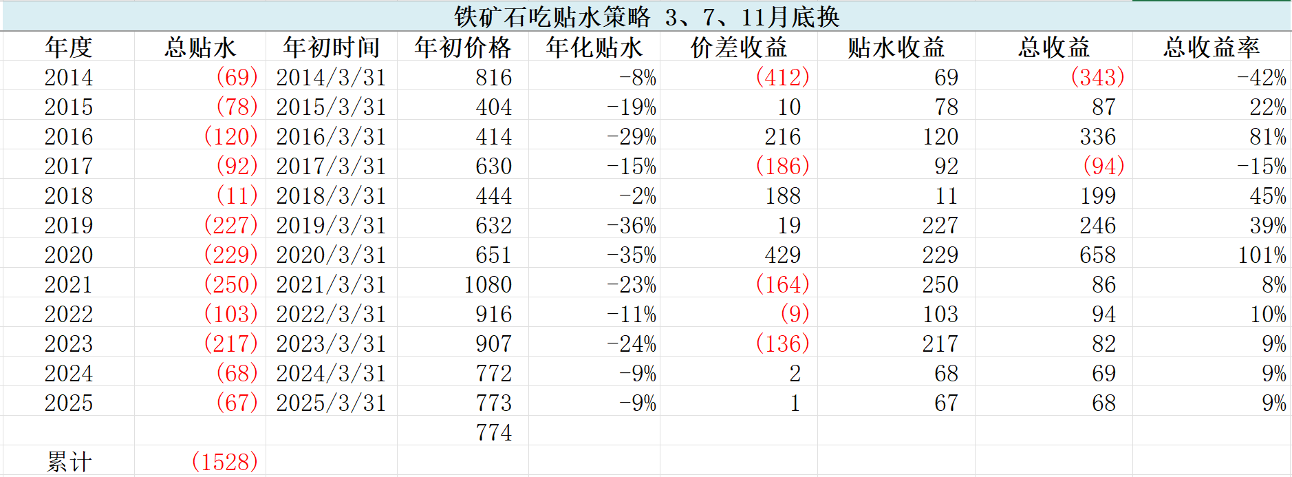 甚至从21年-25年,铁矿不是跌就是平,但是吃贴水策略,每年都赚钱,虽然也只是10%。