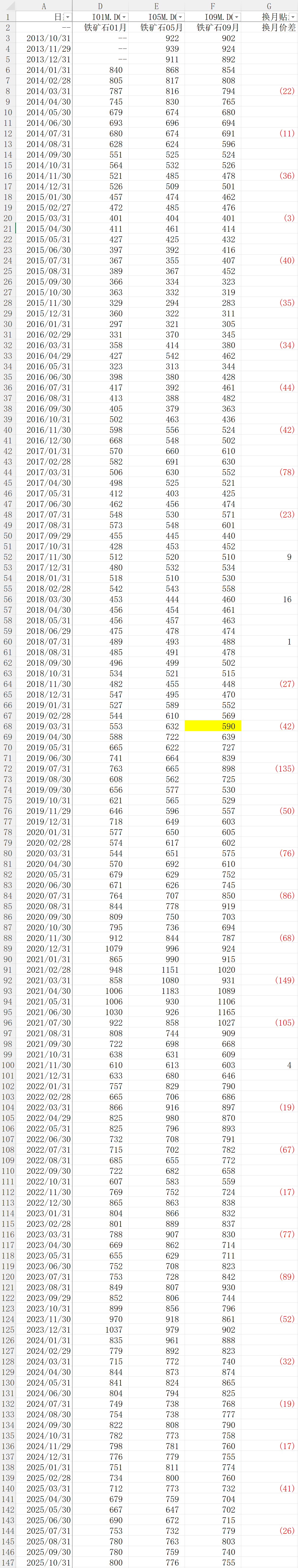 这是按照交割月前一天换仓来计算贴水的表,从表里看铁矿石的贴水在降低,这两年年化只有7个点左右。另外,钢铁的需求在减小,供应却在增大,价格能不能维持住也很让人担心。看新闻中国天天说要争夺铁矿石定价权,主导开发西芒杜铁矿、废钢再利用什么的。大家还有别的类似股指期货吃贴水的策略么?现在股指高了,铁矿石价格高不敢买,豆粕贴水不稳定,什么都不敢买。