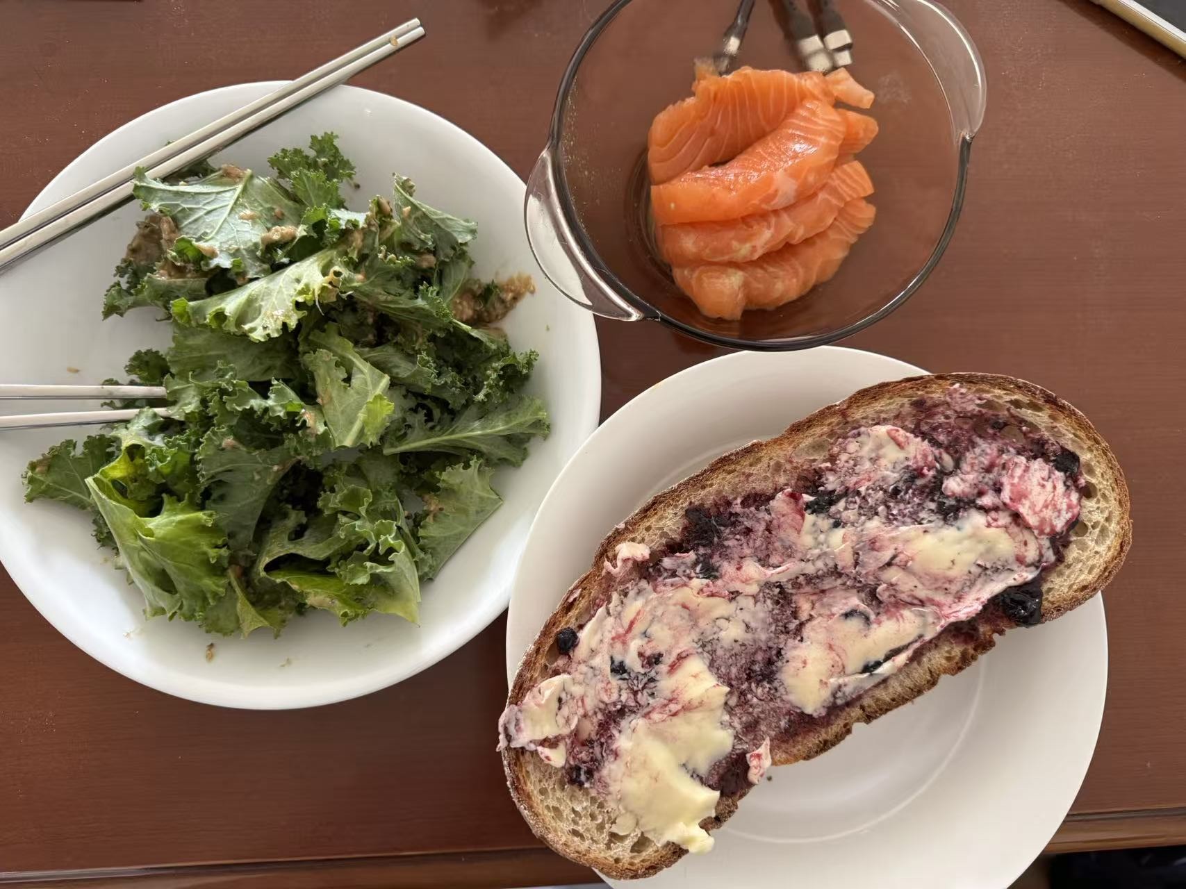 成本羽衣甘蓝4元,坚果酱5元,三文鱼30,面包8,黄油5,蓝莓酱1,大概吧
