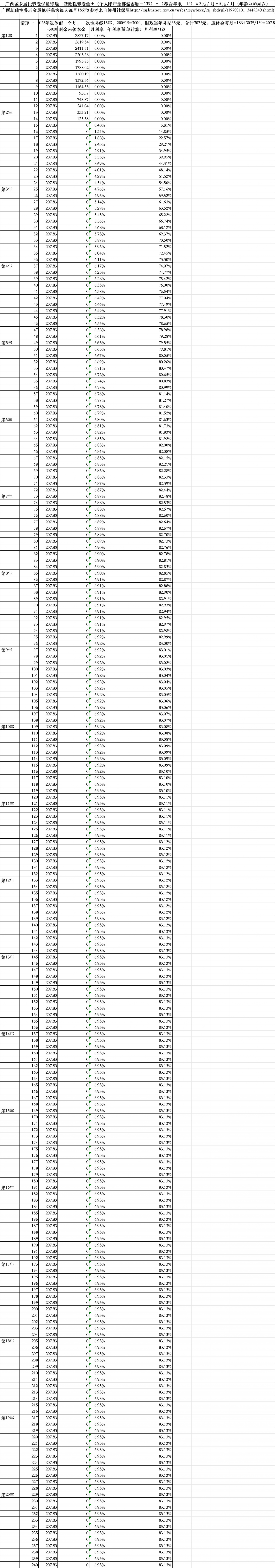 情形一:按 200 元档的补缴 15 年,总共缴纳 3000,补缴的当年财政补贴 35 块,每月领207.83