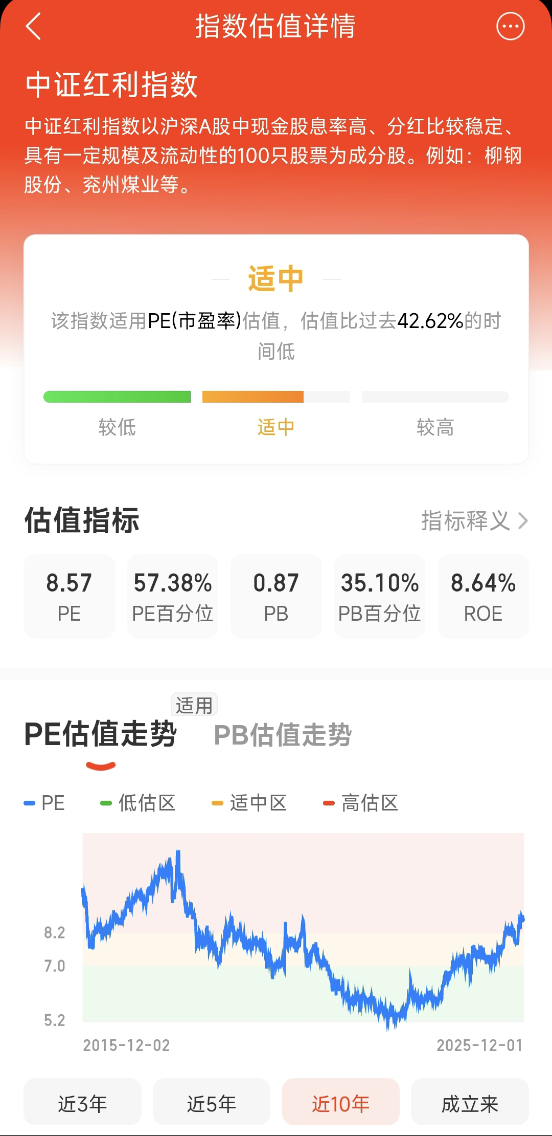 这两种情况概率都是极小的,所以中证红利的估值波动极小,所谓的 "估值低位"、"估值中位"、"估值高位"差不了多少,长期也就是8pe-12pe震荡,买中红,只要不是极值,百分位参考权重不大;中红是最像债券的指数;