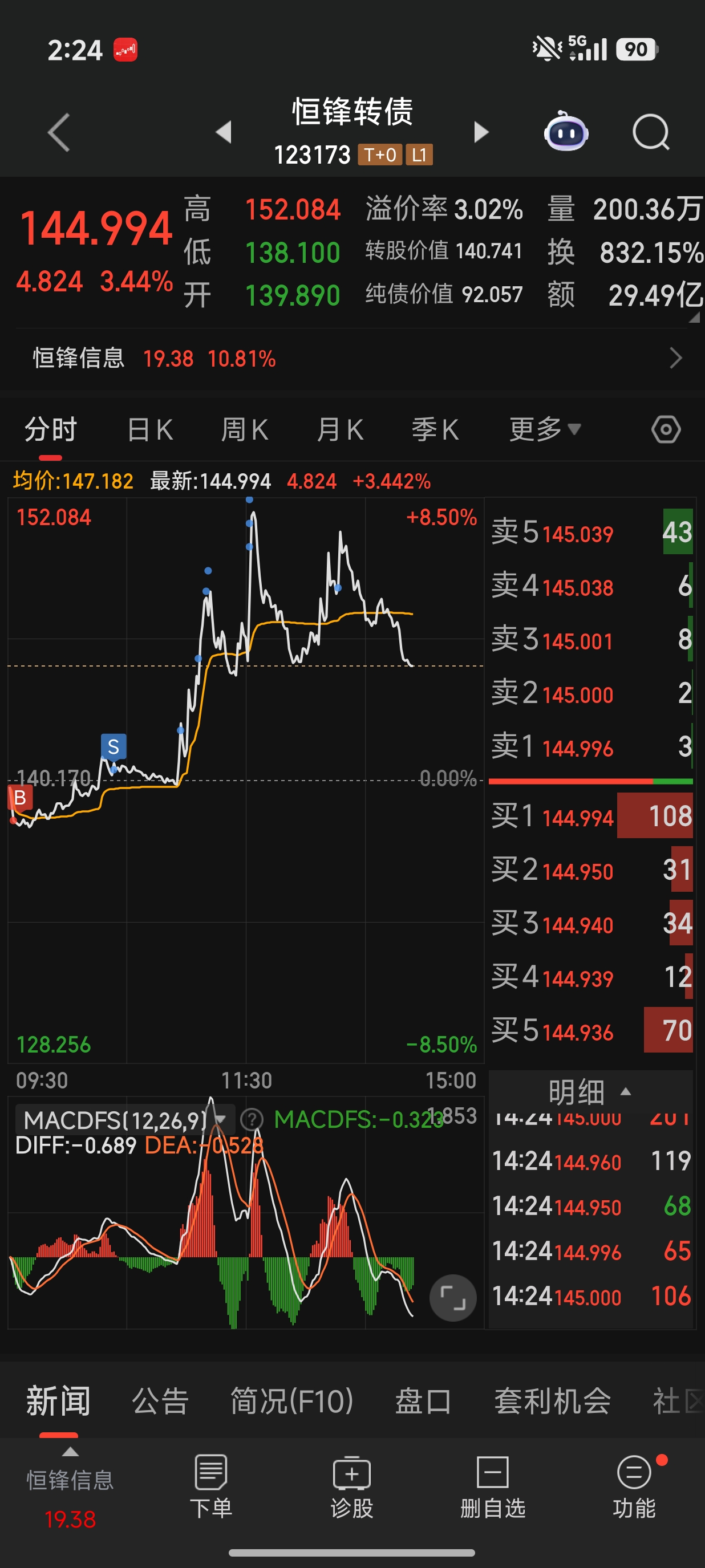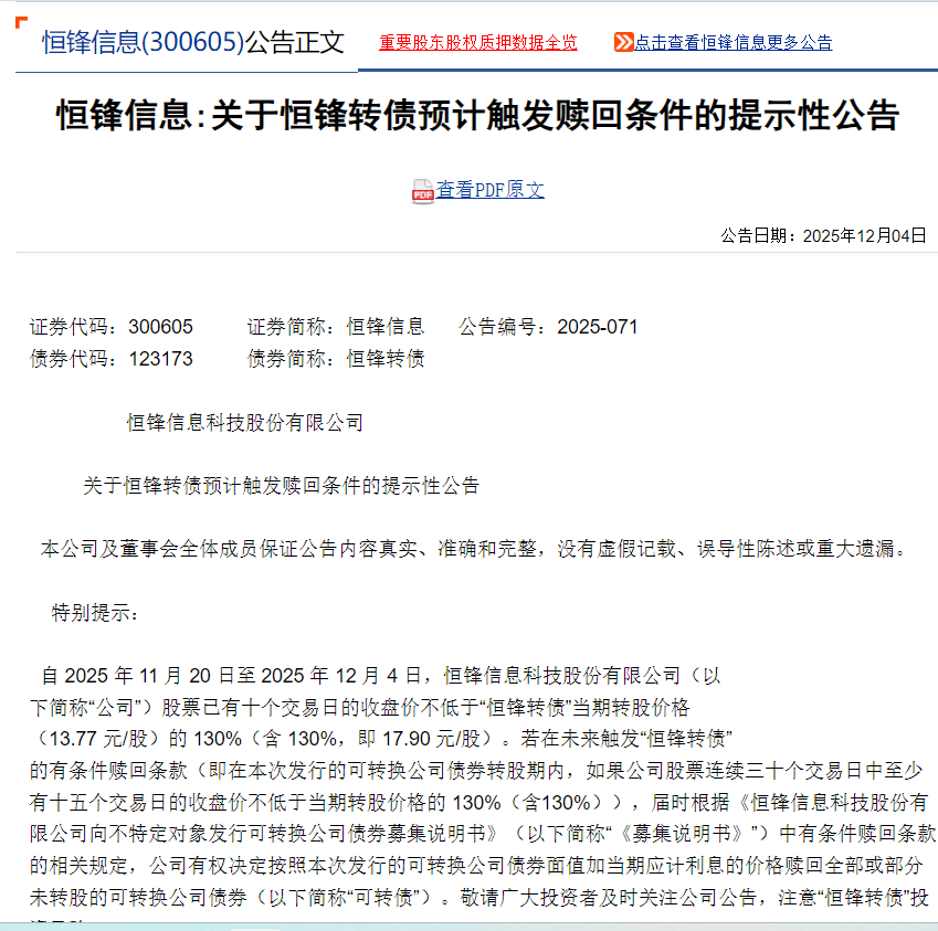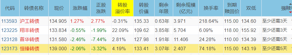 恒峰正股不大跌今日和明日转股价值继续维持在130以上的话,周四晚上会有即将满足强赎回条件的预警公告。