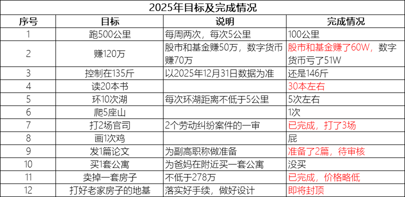 2025年其实最重要的三件事:1、卖掉一套房子(已割肉,亏了一些,降低负债);2、换了一辆小米YU7,刚刚提车,29W(老雅阁卖了7.8W);3、老家建一套房子,主体基本完工,春节前封顶,已经花了25W左右,预计还要5W左右,未来3-5年不准备装修,主要是为了占名额,以及搞一块地用来种菜。