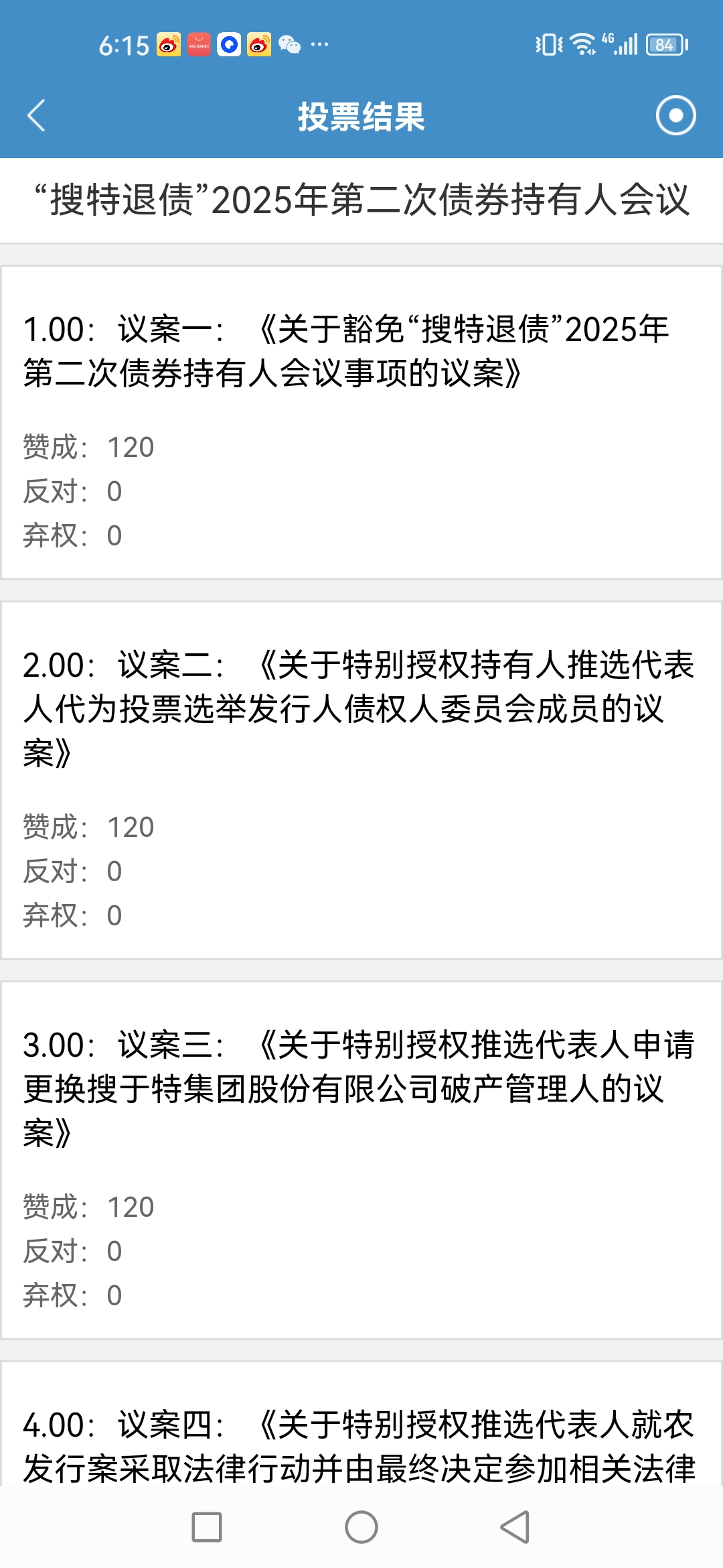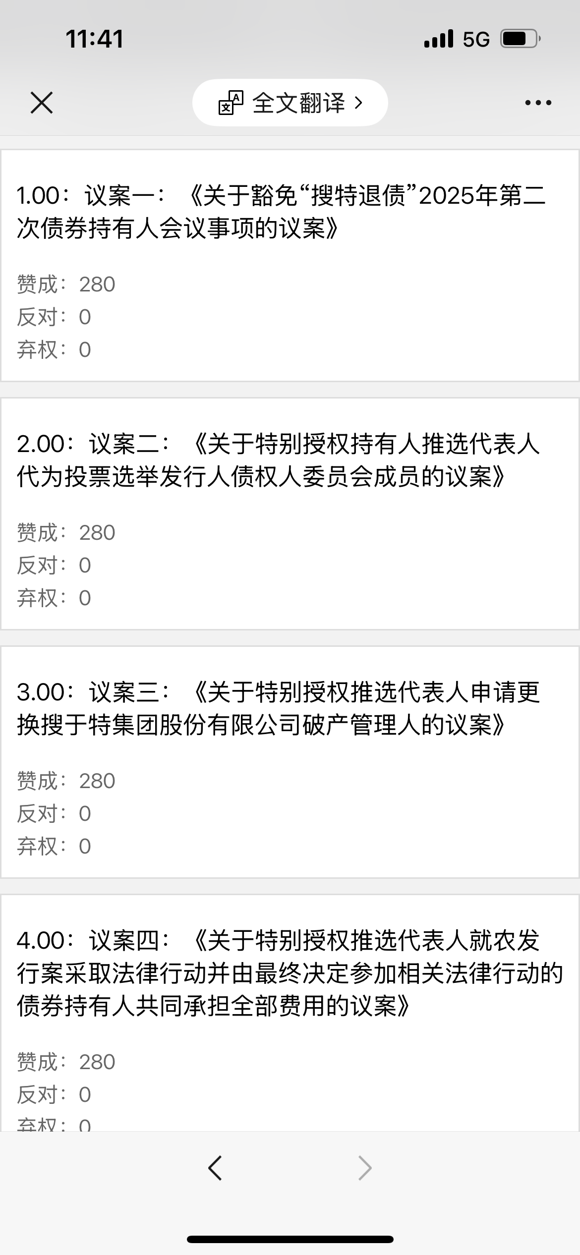 4个议案 全部同意,请大家不要迟疑 !我们搜特退债持有人统一投票,议案一是豁免这次”持有人会议现场会议“需要同意否则后面议案就有风险。 为何免除现场后面详细说,主要是为了在二债会前开,各种曲折后面讲