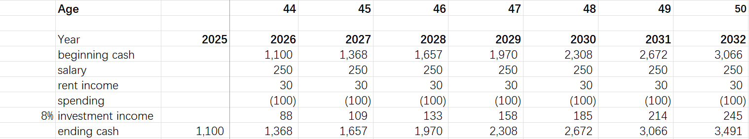 当你50岁时,工资收入多少,投资收入多少,家庭现金资产多少,这个我不知道,多谢认真回复。其实我也没打算50岁就不干了,只是希望能在50岁的时候有足够的积蓄应对不确定性,毕竟那个时候也许我想干也没人要了。