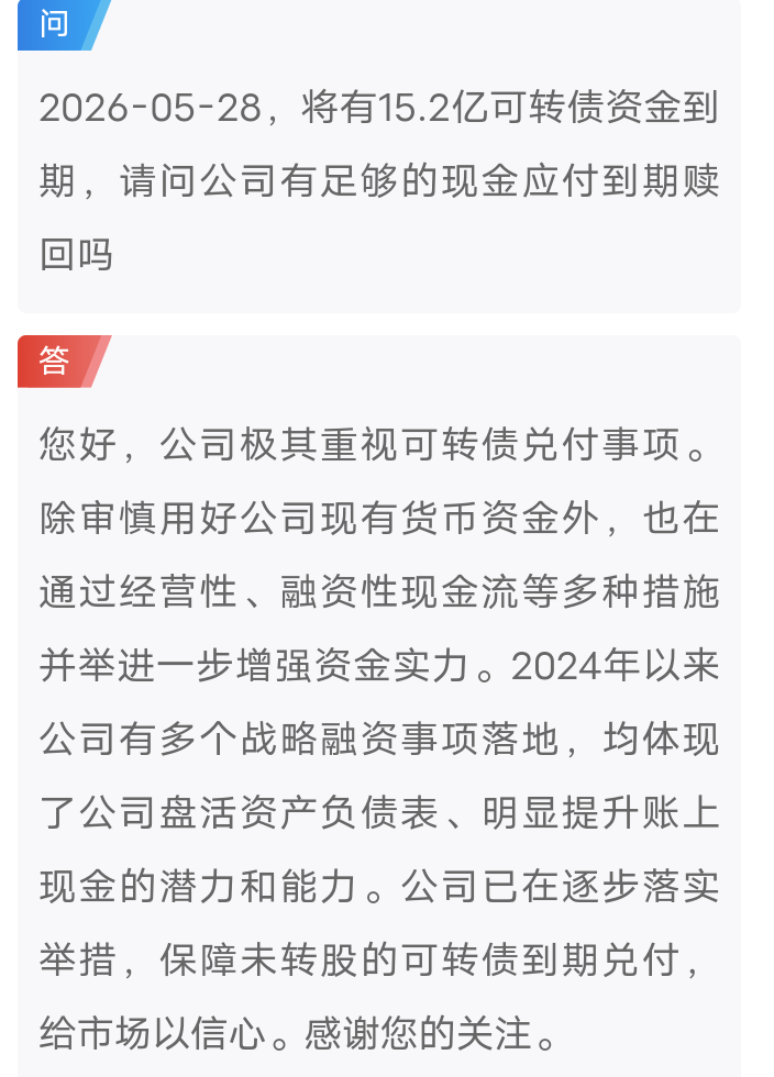 您好,公司极其重视可转债兑付事项。除审慎用好公司现有货币资金外,也在通过经营性、融资性现金流等多种措施并举进一步增强资金实力。2024年以来公司有多个战略融资事项落地,均体现了公司盘活资产负债表、明显提升账上现金的潜力和能力。公司已在逐步落实举措,保障未转股的可转债到期兑付,给市场以信心。感谢您的关注。