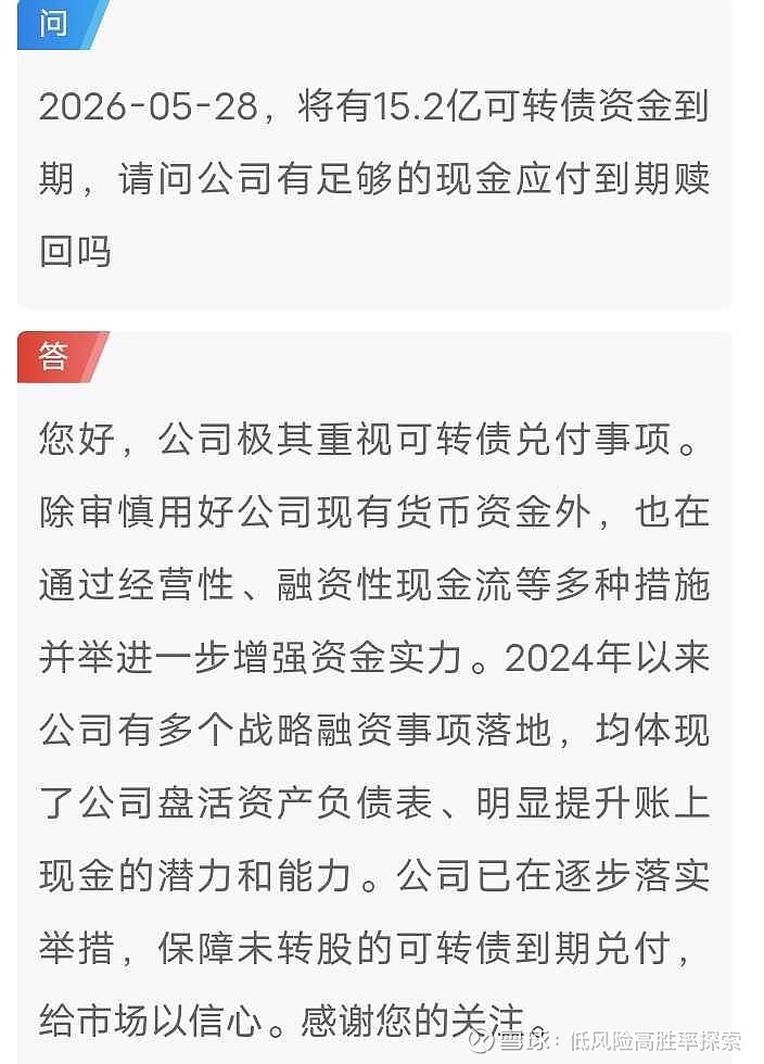 豆包都引用集思录的言论,这几天下跌,有人说是有机构风控跑路,我感觉是集思录大佬跑路,因为都是低风险的思路,能跑就跑!经过分析,蓝帆账上的现金加理财等的总现金有二十多万,外债是可以续期或置换的,子公司发展很好,对赌也是可以延期的,其实真正需要对付的就是可转债,还存在像塞力转债一样一飞冲天的可能!以前的塞力转债也整天鬼故事不断!关键看公司的态度,处理好了就是歌舞升平,处理不好,就是各种挤兑立马完蛋!...另外公司还要17个亿左右的受信额度,公司的防护用品是世界前三,好多国家标准都是其牵头或参与制定的,心脑事业部具有核心高科技,盈利向好,上海张江有投资24多的总部已近完工,大家还担心的高商誉问题,其实即使把商誉归零,其负债率也就百分之五十四左右,也算正常