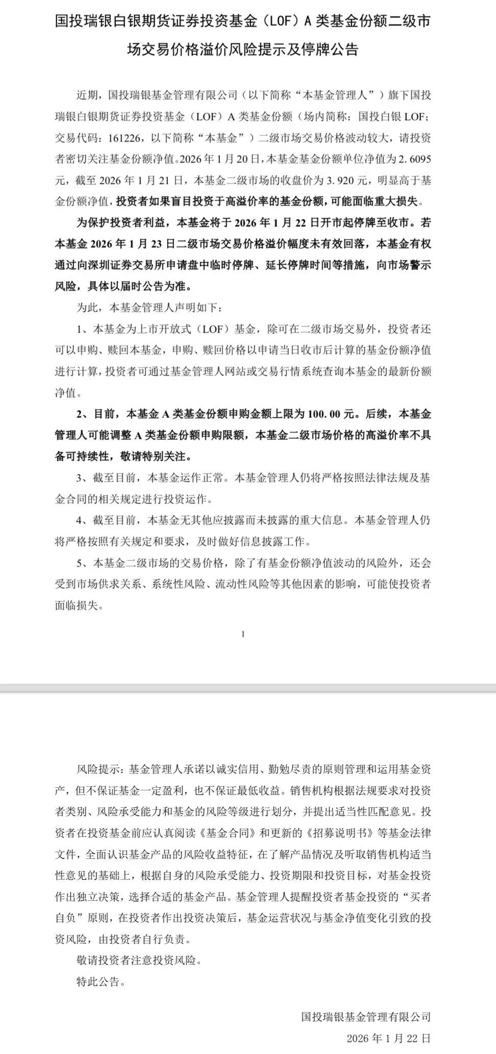 2026年1月23日,国投白银LOF场内份额351,782.87万份,新增3,008万份,1个身份证申购100元,相当于79.16万人申购。
