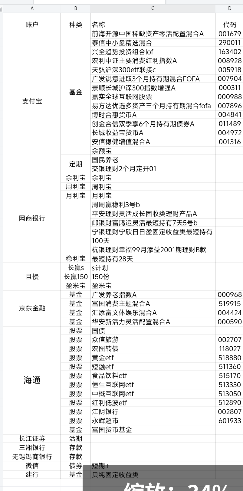 虽然大部分投资手段都有,但是常操作的就是A股、港股和货币基金。采用净值法计算资产,每周详细统计一次各个账户,并写一下总结。