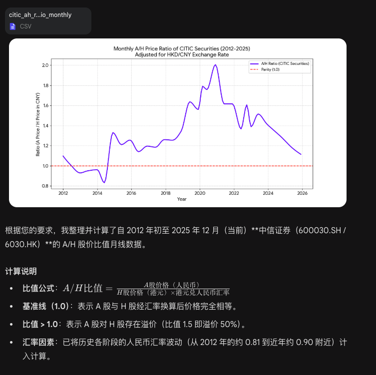事情是这样的,今天突发奇想,想用ai 做这个:帮我做一张图表,内容是中信证券A股和H股的比值月线图,时间从2012年开始至今,要充分考虑人民币和港元的汇率因素。