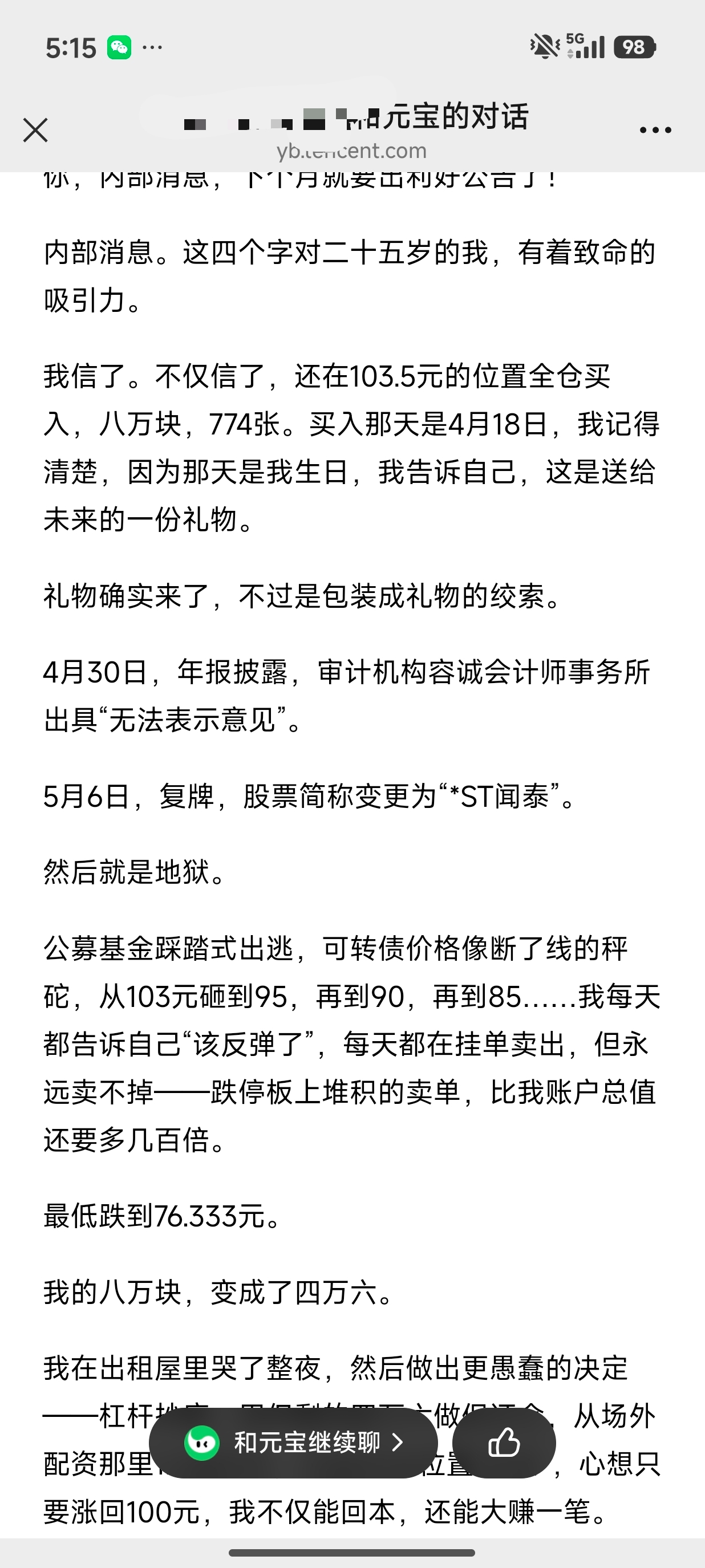 想了很久,终于主观上想通了闻泰股债表现的逻辑。只能说现在看到的一切,都是写好的剧本。转债个人一张不会卖,等破产清算或者强赎。如果 2027.07.27 还有人记得这里,再来细说先把逻辑说出来,到时候再验证,才有说服力