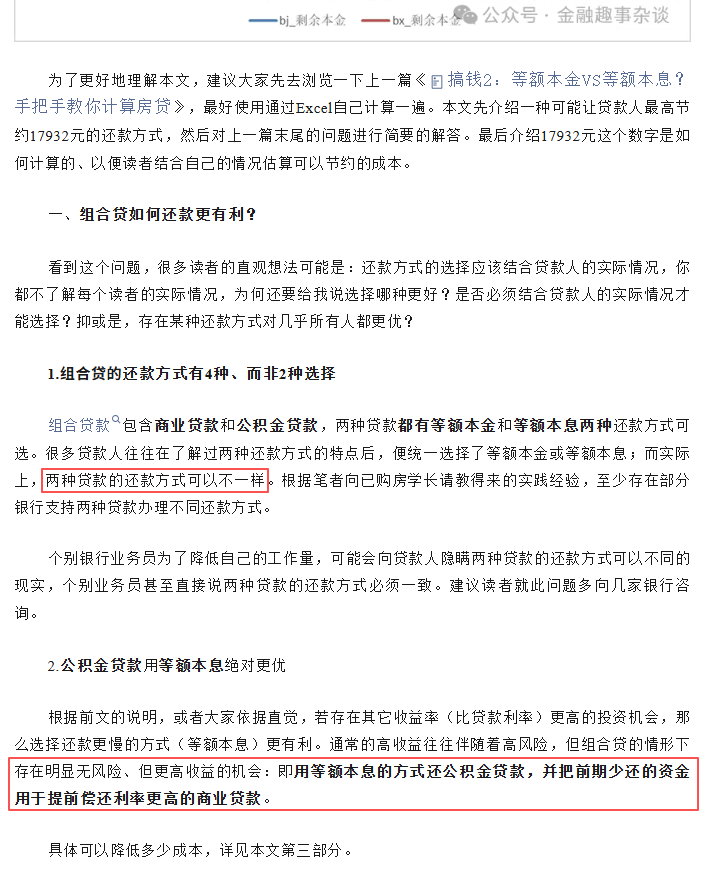 作者主要想说的是,在组合贷款的情形下,由于涉及了两个利率不同的贷款,那么低利率的贷款最好就用慢一点的还款方式,这个不受个人的具体情况影响。我是同意这个直觉的,我看有几位了解到讨论的是组合贷的老师也都赞成这个。我只是好奇,纯粹是把低利率贷款的还款方式从等额本金改成等额本息,然后就可以节省17932元?我对这个数字的量级和计算过程有点拿不准,到底是标题党?还是真有那么多?