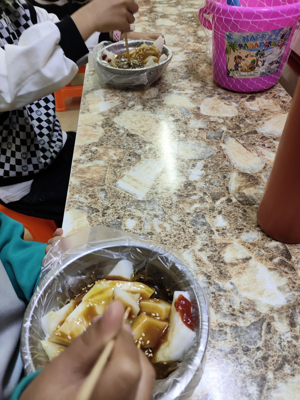 由于场地比较小,舞台也很小,婚庆公司搞的流程也比较简短,整个婚礼过程也就几十分钟就结束了。接下来就是吃席了,席间有很多他们特色的菜品,我都叫不上名字来,有一些我问过他们好像是鱼糕肉糕,之前我在武汉的时候也没有吃过。席上的汤和饭以甜食为主,这和北方差距还是挺大的,我老家那边汤很多都是以酸味为主。