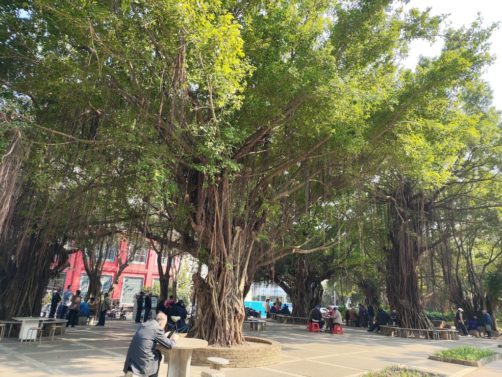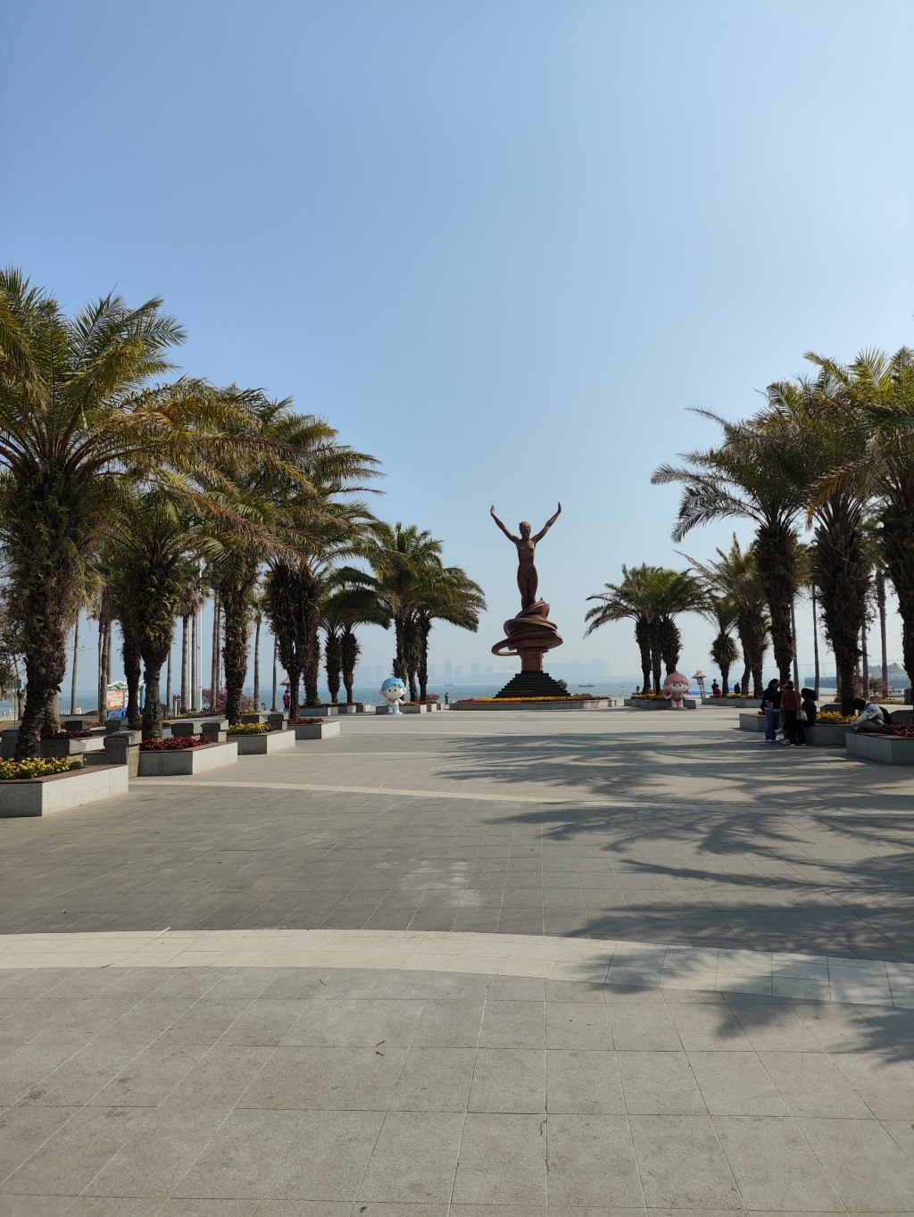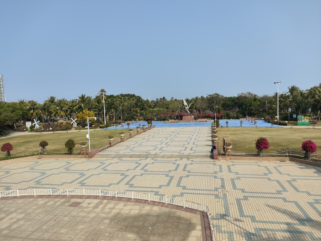 下午从岛上返回后,我们就去了附近的海滨公园。公园里处处可见几人围抱不过来的大榕树,榕树下成了老年人们的休闲地。自从有了电动车游玩,真是方便了很多,可以边走边玩。我们一路向北又来到了金沙湾沙滩,途中还在南国热带花园玩了一下。